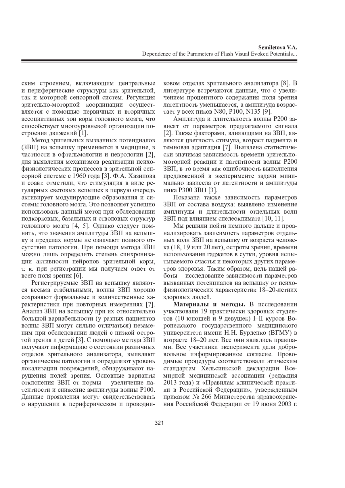 Материалы и методы. Исследование проведено на базе кафедры нормальной физиологии Воронежского государственного медицинского университета имени Н. Н. Бурденко. В нем приняли участие 19 практически здоровых студентов обоего пола в возрасте 18-20 лет. Все они являлись правшами. У испытуемых измерялись масса тела, рост, определялись острота зрения по таблице Сивцева, зрачковый рефлекс, ситуативная и личностная тревожность по Спилбергеру, уровень счастья по 10-балльной шкале, среднее время за компьютером (телефоном) в сутки, а также самочувствие, активность и настроение (опросник САН). ЗВП регистрировались в стандартных условиях (в состоянии покоя, сидя, с закрытыми глазами) при помощи нейромиоанализатора НМА-4-01 «Нейромиан» (Россия). Проанализированы взаимосвязи психофизиологических параметров с амплитудой и длительностью волн ЗВП. Результаты. Подтверждены данные Р. Н. Зеленцова и Л. В. Поскотиновой (2020) о взаимосвязи параметров ЗВП на вспышку с возрастом и об отсутствии их взаимосвязи с остротой зрения взрослого здорового человека. Показано, что увеличение времени, затраченного на взаимодействие с гаджетами, синхронизирует работу нейронов стволовых структур мозга. Психологическое состояние человека влияет не только на синхронизацию нейронов 17-го поля коры больших полушарий, но и на все уровни генерализации ЗВП и является отражением интенсивности обработки информации. Отмечено, что временные параметры ЗВП фактически демонстрируют условия, в которых работает зрительная система, и указывают на состояние обеспечивающих зрение структур, а амплитудные параметры ЗВП связаны с психофизиологическим состоянием человека.