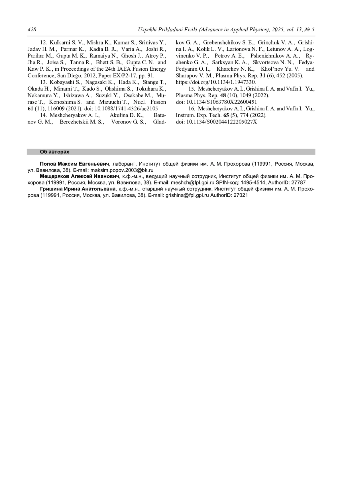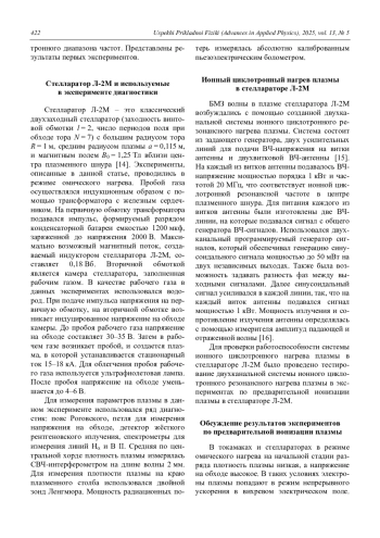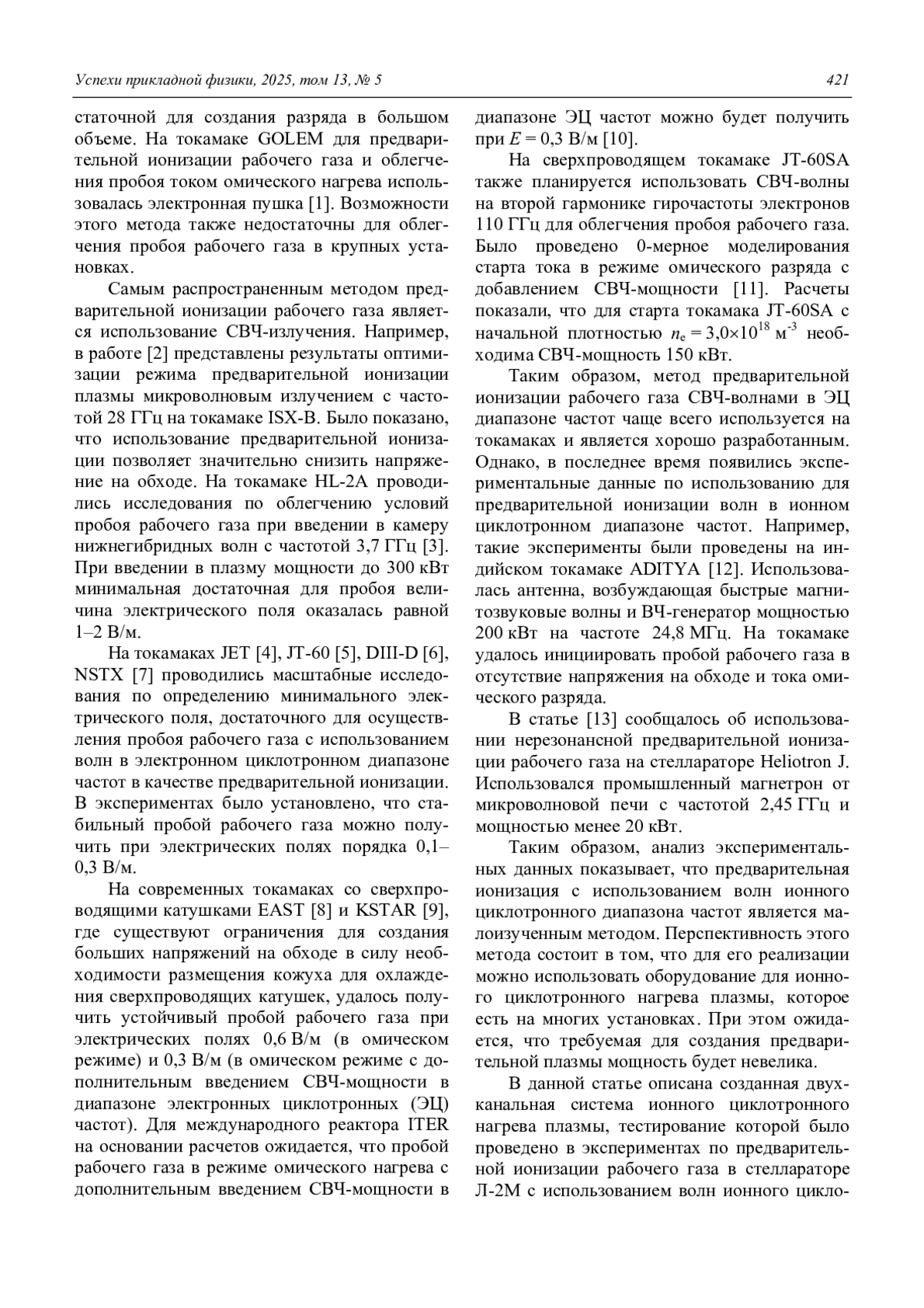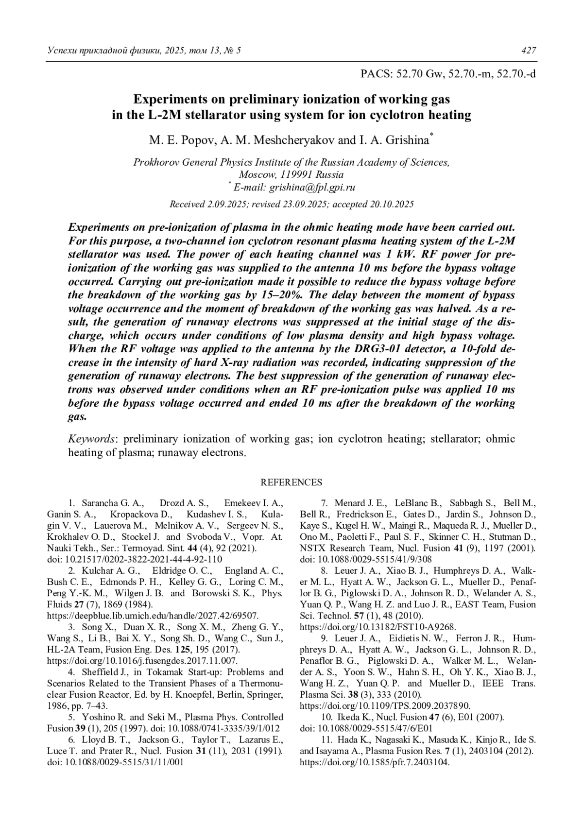 Проведены эксперименты по предварительной ионизации плазмы стелларатора Л-2М с использованием двухканальной системы ионного циклотронного резонансно-го нагрева. Мощность каждого канала нагрева составляла 1 кВт. ВЧ-мощность для предварительной ионизации рабочего газа подавалась на антенну за 10 мс до возникновения напряжения на обходе. Проведение предварительной ионизации позволило уменьшить напряжение на обходе перед пробоем рабочего газа на 15–20 %. Задержка между моментом возникновения напряжения на обходе и моментом пробоя рабочего газа уменьшилась вдвое. Вследствие этого наблюдалось подавление генерации убегающих электронов на начальной стадии разряда, возникающей в условиях низкой плотности плазмы и высокого напряжения на обходе. При подаче ВЧ-напряжения на антенну детектором ДРГ3-01 было зарегистрировано уменьшение интенсивности жесткого рентгеновского излучения в 10 раз, что указывает на подавление генерации убегающих электронов. Наилучшее подавление генерации убегающих электронов наблюдалось в условиях, когда ВЧ-импульс предварительной ионизации подавался за 10 мс до возникновения напряжения на обходе и заканчивался через 10 мс после пробоя рабочего газа.