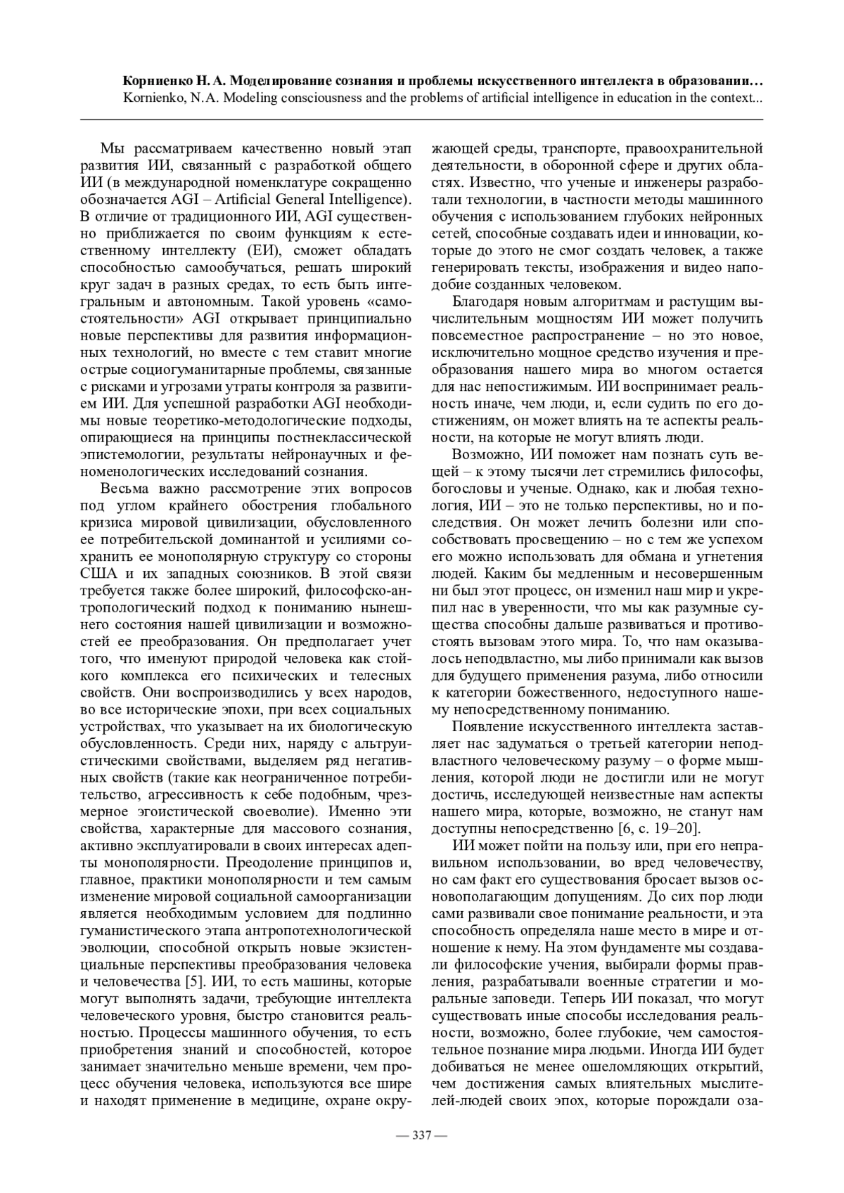 31. Корниенко Н.А. Феномен сознания и проблемы искусственного интеллекта в условиях глобализации // Цифровая трансформация и искусственный интеллект: материалы всероссийской научно-практической конференции с международным участием в рамках форума участников китайско-российского союза высших педагогических учебных заведений (г. Новосибирск, 17 ноября 2022) / под ред. И.В. Сартакова. Новосибирск: Изд-во НГПУ. 2022. С. 18-33.