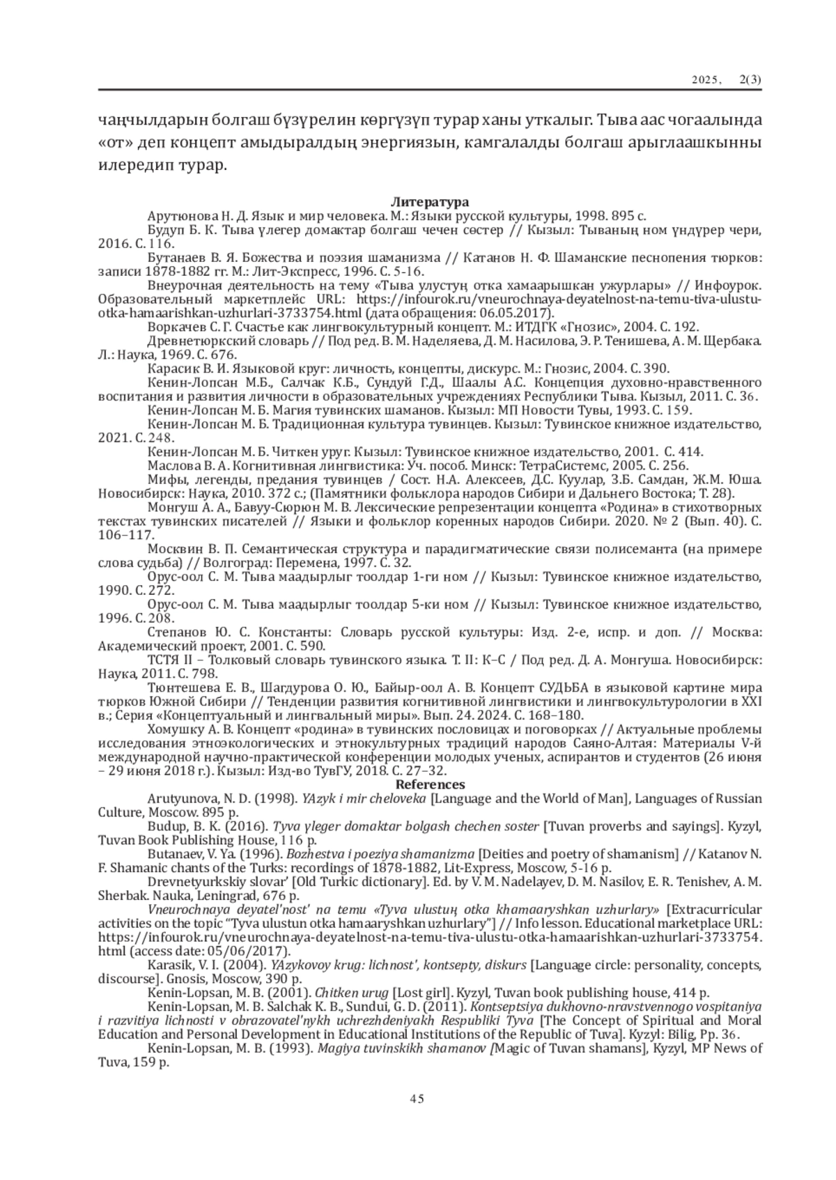 14. Монгуш А. А., Бавуу-Сюрюн М. В. Лексические репрезентации концепта “Родина” в стихотворных текстах тувинских писателей // Языки и фольклор коренных народов Сибири. 2020. № 2 (Вып. 40). С. 106-117.