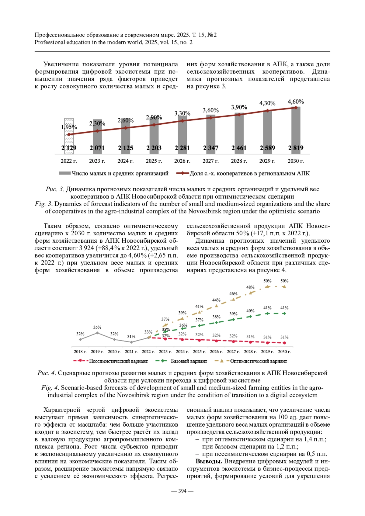 В Новосибирской области сложились все необходимые условия для перевода агропромышленного комплекса на более высокий технологический уровень, где центральное место занимает цифровизация экономических отраслей. Агропромышленный комплекс является одним из наиболее динамично развивающимся сектором региональной экономики, что связано в том числе и с внедрением цифровых технологий. Тем не менее их потенциал в сельском хозяйстве области раскрыт не полностью, поскольку цифровизация преимущественно охватывает крупные агрохолдинги и предприятия, тогда как малые и средние формы хозяйствования (МСФХ) сталкиваются с трудностями из‑за высокой стоимости таких решений. Для устранения этого дисбаланса необходимо создание цифровой экосистемы в региональном агропромышленном комплексе, которая обеспечит, в первую очередь, малым и средним хозяйствам доступ к цифровым сервисам и рынкам сбыта. Дальнейшее развитие МСФХ в АПК Новосибирской области с учетом интеграции цифровых инструментов и сервисов требует разработки прогнозных сценариев.