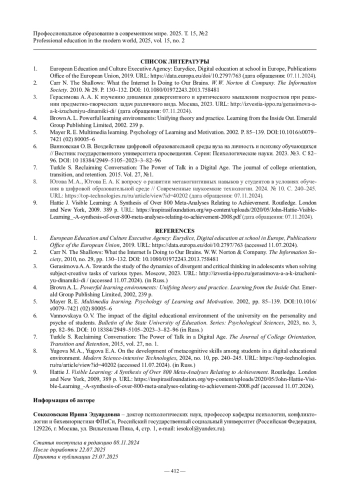 6. Ванновская O.В. Воздействие цифровой образовательной среды вуза на личность и психику обучающихся // Вестник государственного университета просвещения. Серия: Психологические науки. 2023. № 3. С 82- 96. https://doi.org/1018384/2949-5105-2023-3-82-96
