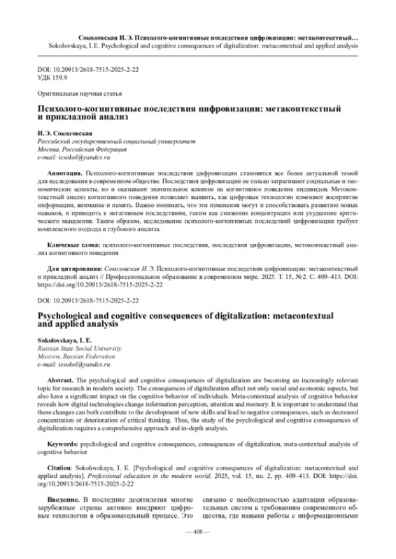 Психолого-когнитивные последствия цифровизации становятся все более актуальной темой для исследования в современном обществе. Последствия цифровизации не только затрагивают социальные и экономические аспекты, но и оказывают значительное влияние на когнитивное поведение индивидов. Метоконтекстный анализ когнитивного поведения позволяет выявить, как цифровые технологии изменяют восприятие информации, внимание и память. Важно понимать, что эти изменения могут и способствовать развитию новых навыков, и приводить к негативным последствиям, таким как снижение концентрации или ухудшение критического мышления. Таким образом, исследование психолого-когнитивных последствий цифровизации требует комплексного подхода и глубокого анализа.