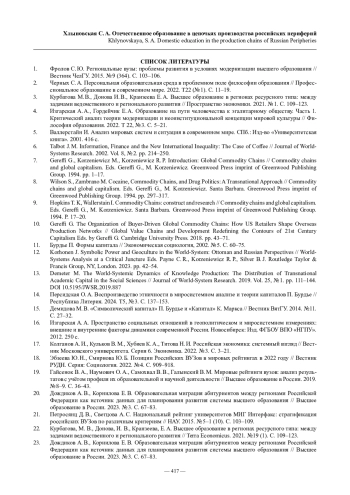 22. Курбатова, М. В., Донова, И. В., Кранзеева, Е.А. Высшее образование в регионах ресурсного типа: между задачами ведомственного и регионального развития // Terra Economicus. 2021. №19 (1). С. 109-123.