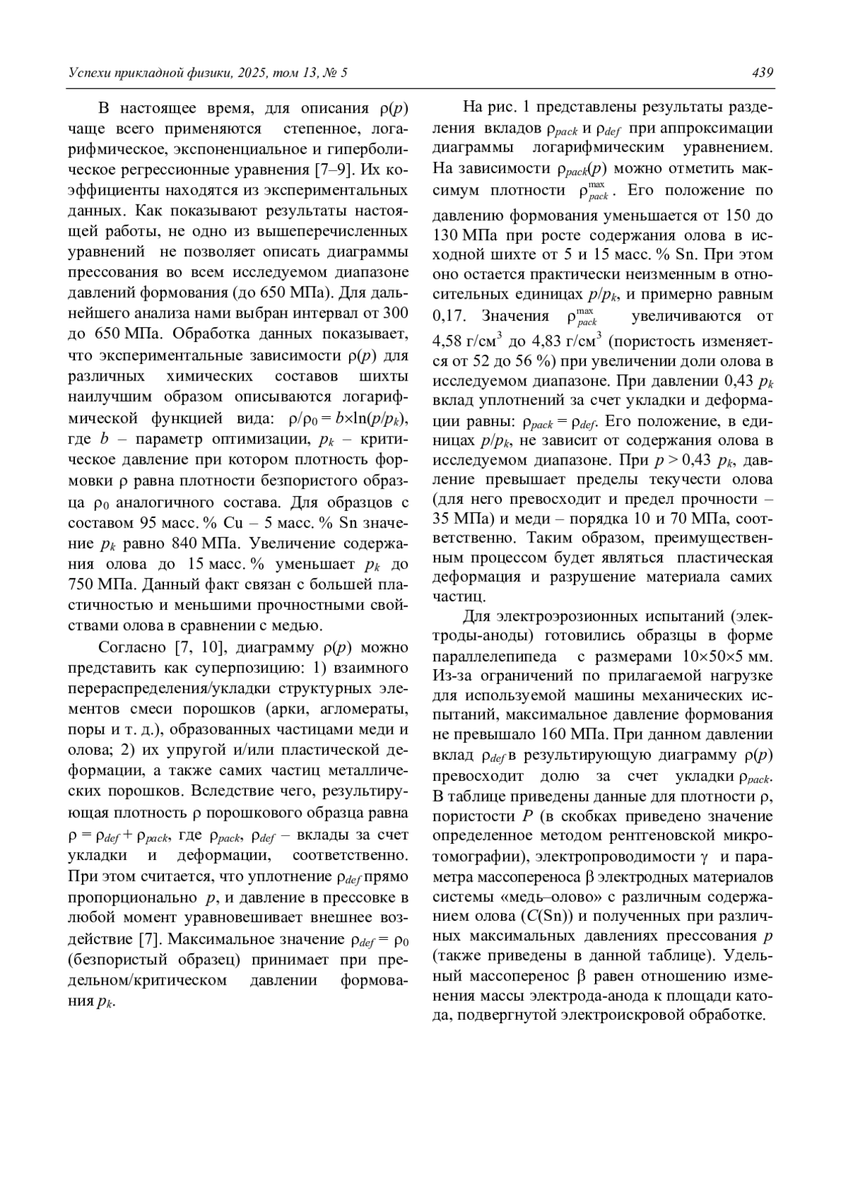 Определены плотность, пористость, электропроводность и коэффициент массопереноса (при электроискровой обработке) порошковых электродных материалов системы «медь – олово». Они были получены методом холодного одностороннего формования смеси порошков металлов в закрытой пресс-форме. Диаграмма «плотность – давление прессования» является суперпозицией взаимного перераспределения/укладки структурных элементов порошкового материала и их упругой/пластической деформации. Определены критические давления формования (при аппроксимации логарифмической функцией). На зависимости от давления вклада укладки имеется максимум. Он смещается в область малых давлений формования при росте содержания олова в исходной шихте. В относительных единицах давления (по отношению к критическому) его положение остается практически неизменным. Увеличение давления формования и содержания олова приводит к росту плотности и электропроводности конечного материала, а также уменьшению его пористости. Рост энергии электроискрового разряда и содержания олова, а также уменьшение давления прессования приводят к увеличению коэффициента массопереноса.