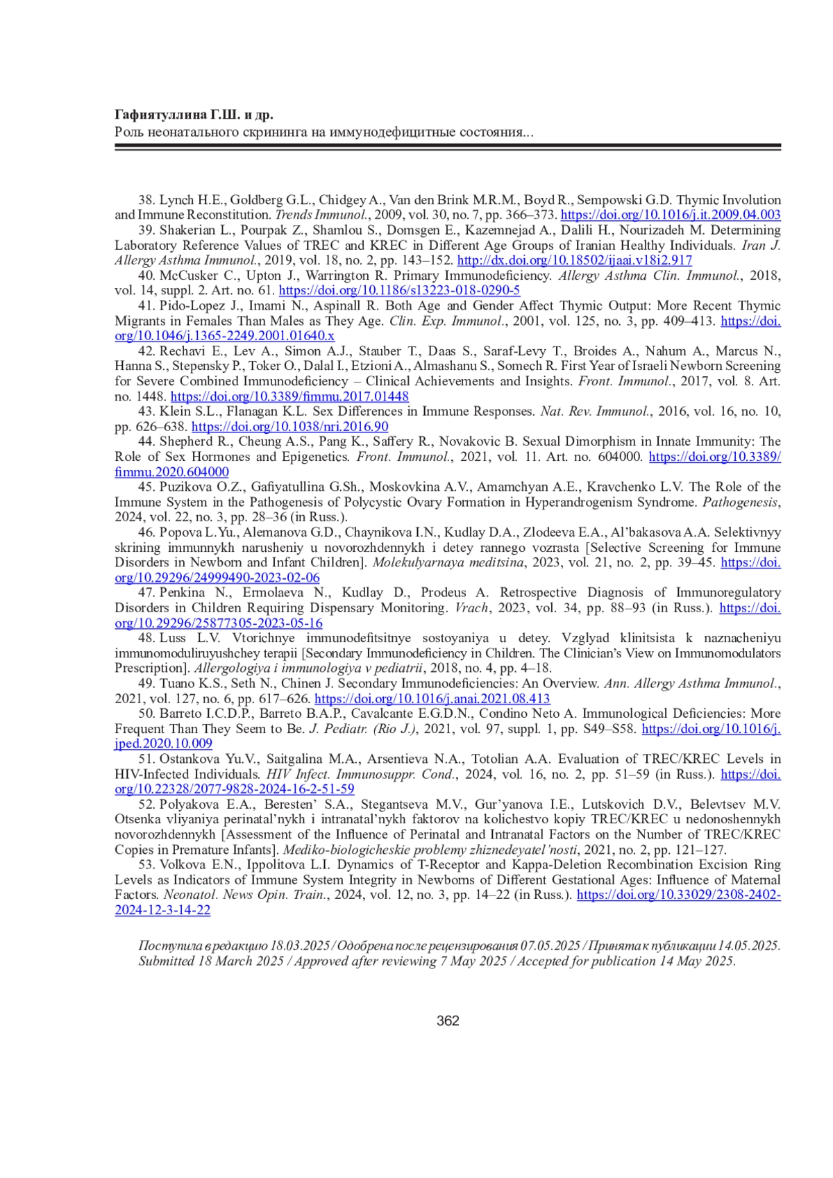 16. Ипполитова Л.И., Иванцова Е.Н., Кудлай Д.А., Паничев К.В., Кокорева С.П. TREC и KREC у новорожденных разного гестационного возраста // Молекуляр. медицина. 2023. Т. 21, No 3. С. 65-72. DOI: 10.29296/24999490-2023-03-09 EDN: JAGQVO
