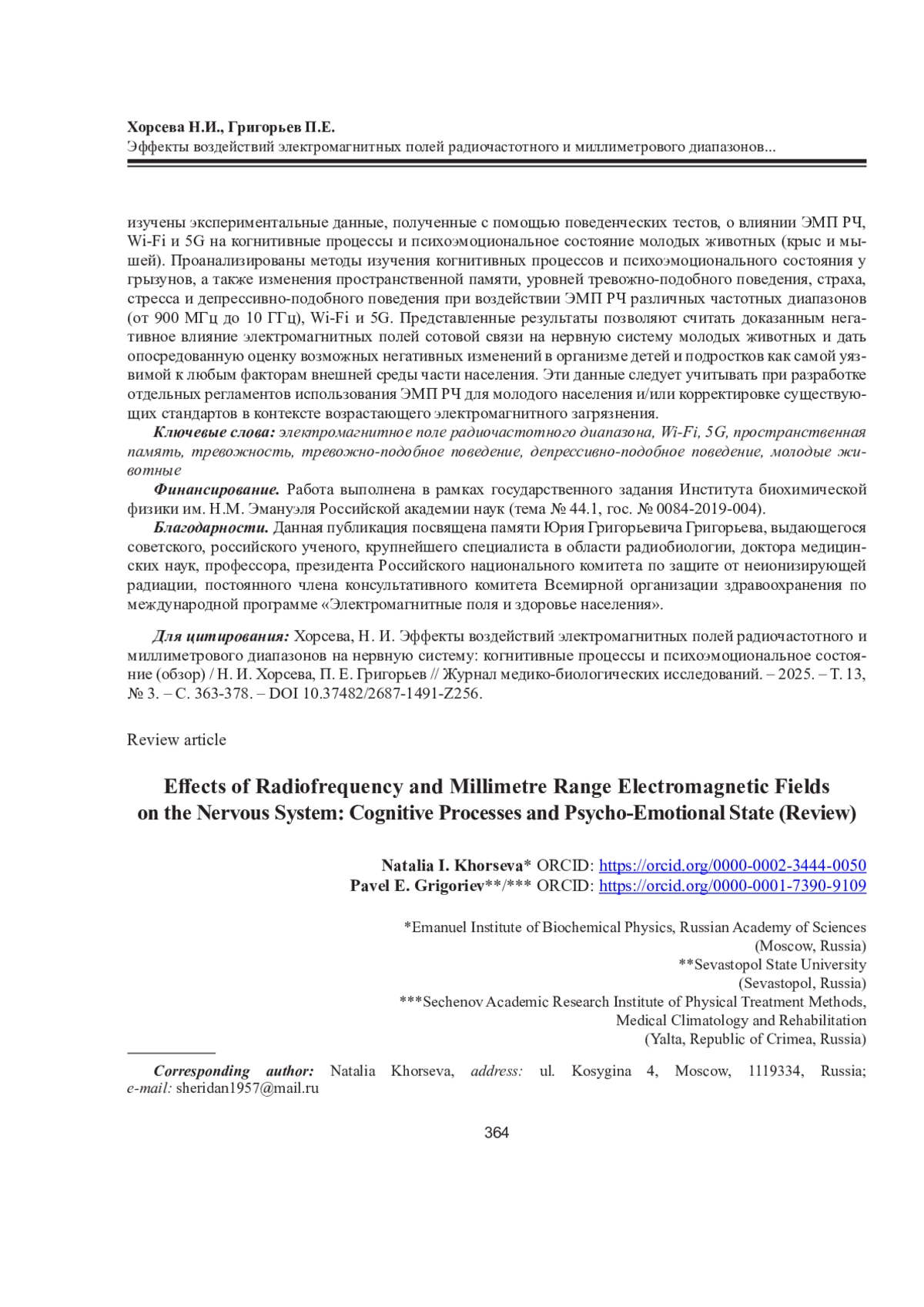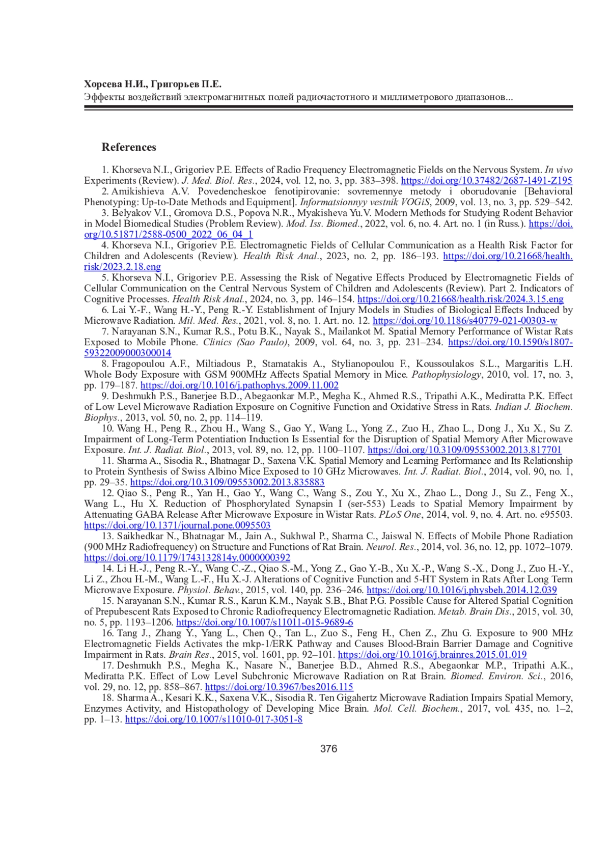 1. Хорсева Н.И., Григорьев П.Е. Эффекты воздействий радиочастотных электромагнитных полей на нервную систему. Эксперименты in vivo (обзор) // Журн. мед.-биол. исслед. 2024. Т. 12, No 3. С. 383-398. DOI: 10.37482/2687-1491-Z195