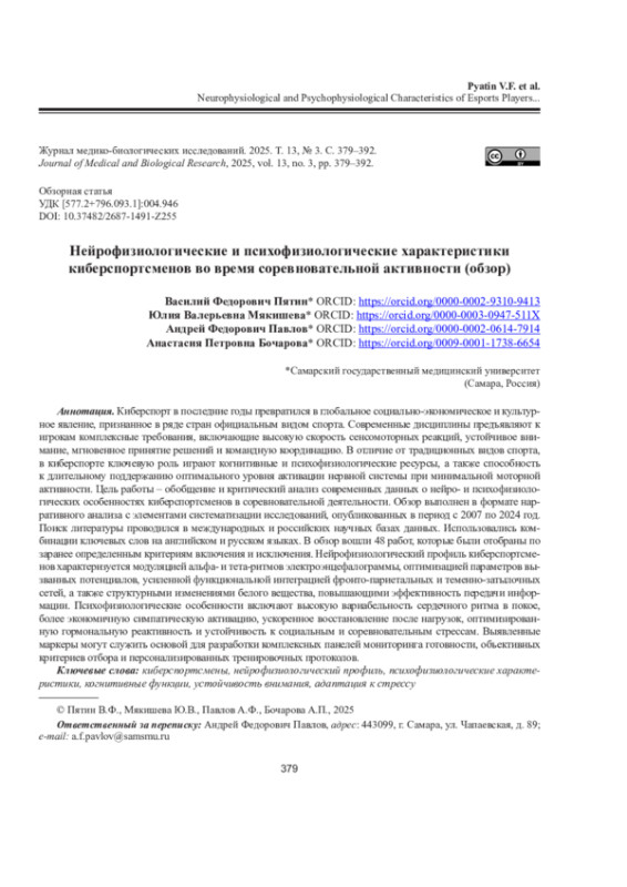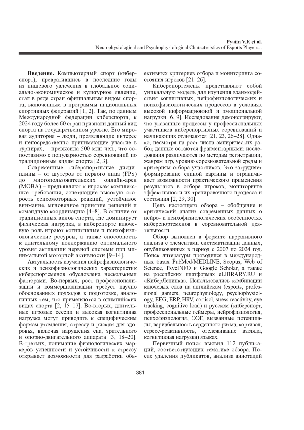 Киберспорт в последние годы превратился в глобальное социально-экономическое и культурное явление, признанное в ряде стран официальным видом спорта. Современные дисциплины предъявляют к игрокам комплексные требования, включающие высокую скорость сенсомоторных реакций, устойчивое внимание, мгновенное принятие решений и командную координацию. В отличие от традиционных видов спорта, в киберспорте ключевую роль играют когнитивные и психофизиологические ресурсы, а также способность к длительному поддержанию оптимального уровня активации нервной системы при минимальной моторной активности. Цель работы - обобщение и критический анализ современных данных о нейро- и психофизиологических особенностях киберспортсменов в соревновательной деятельности. Обзор выполнен в формате нарративного анализа с элементами систематизации исследований, опубликованных в период с 2007 по 2024 год. Поиск литературы проводился в международных и российских научных базах данных. Использовались комбинации ключевых слов на английском и русском языках. В обзор вошли 48 работ, которые были отобраны по заранее определенным критериям включения и исключения. Нейрофизиологический профиль киберспортсменов характеризуется модуляцией альфа- и тета-ритмов электроэнцефалограммы, оптимизацией параметров вызванных потенциалов, усиленной функциональной интеграцией фронто-париетальных и теменно-затылочных сетей, а также структурными изменениями белого вещества, повышающими эффективность передачи информации. Психофизиологические особенности включают высокую вариабельность сердечного ритма в покое, более экономичную симпатическую активацию, ускоренное восстановление после нагрузок, оптимизированную гормональную реактивность и устойчивость к социальным и соревновательным стрессам. Выявленные маркеры могут служить основой для разработки комплексных панелей мониторинга готовности, объективных критериев отбора и персонализированных тренировочных протоколов.