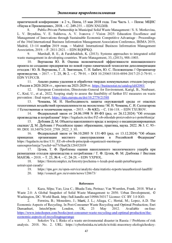 8. Public-Private Partnership in Municipal Solid Waste Management / S. S. Morkovina, L. V. Bryndina, V. E. Sukhova, A. V. Ivanova // Vision 2025: Education Excellence and Management of Innovations through Sustainable Economic Competitive Advantage: Proceedings of the 34rd International Business Information Management Association Conference, IBIMA 2019, Madrid, 13-14 ноября 2019 года. - Madrid: International Business Information Management Association, 2019. - P. 2811-2821. EDN: RQHPKQ