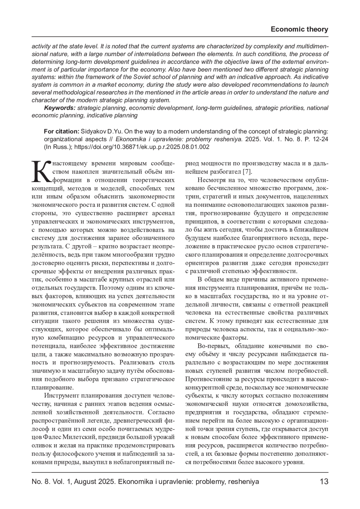 В контуре настоящего исследования рассмотрены некоторые концептуальные вопросы, связанные с поиском путей обновлённого восприятия сущности стратегического планирования экономической деятельности с учётом современных механизмов ведения хозяйственной деятельности на национальном уровне. Отмечено, что нынешние системы характеризуются сложностью и многоаспектностью, большим количеством взаимосвязей между элементами. В подобных условиях особое значение для экономики приобретает процесс определения долгосрочных ориентиров развития в соответствии с объективными закономерностями внешней среды. Изучены отдельные особенности ведения подобной деятельности в двух различных системах: в рамках советской школы планирования и при индикативном подходе. Учитывая, что последний широко применяется в условиях рыночной экономики, были разработаны рекомендации по организации методологических исследований по отражённым в статье направлениям с целью осмысления природы и характера современной системы стратегического планирования.