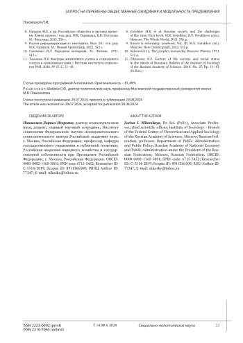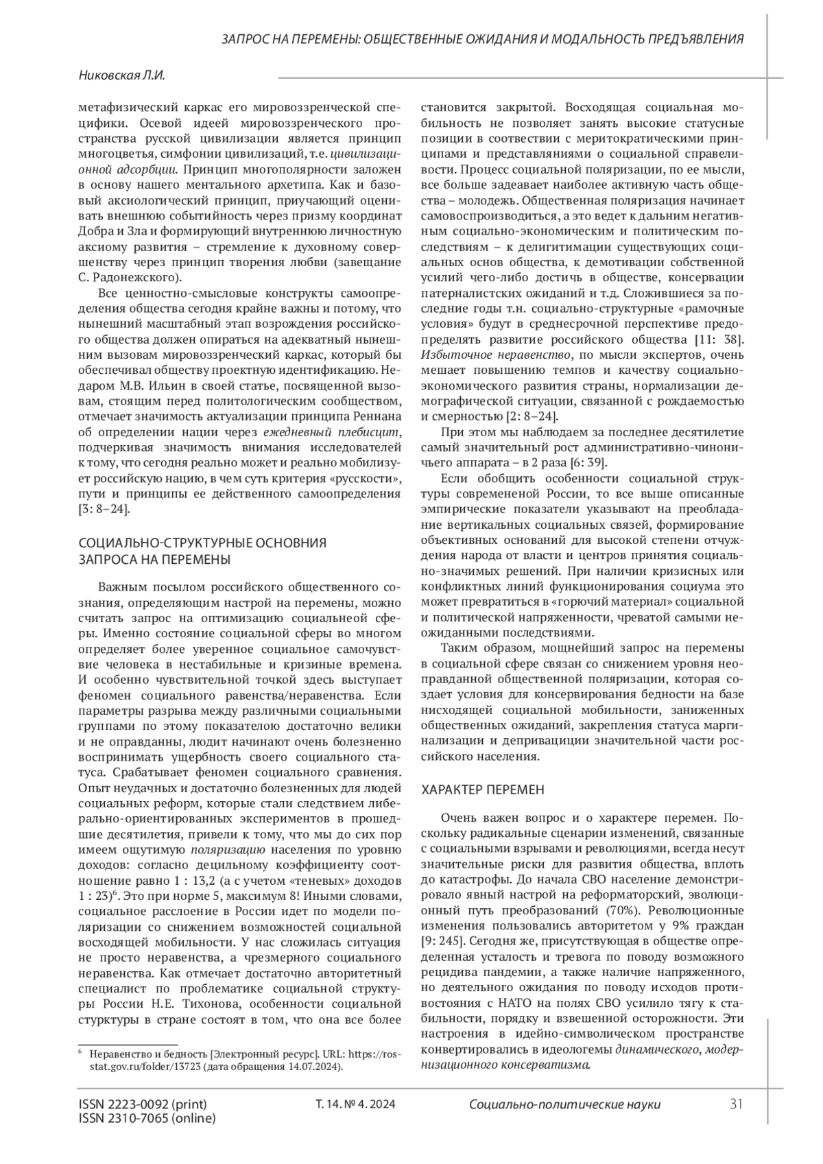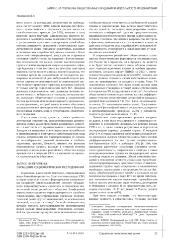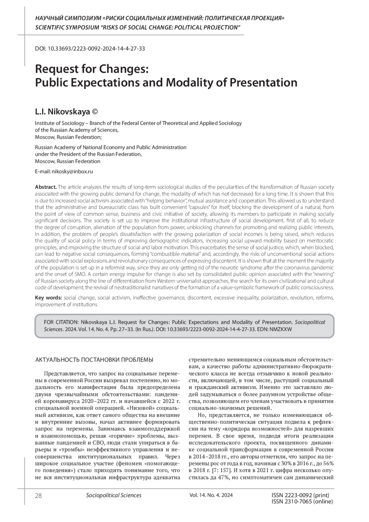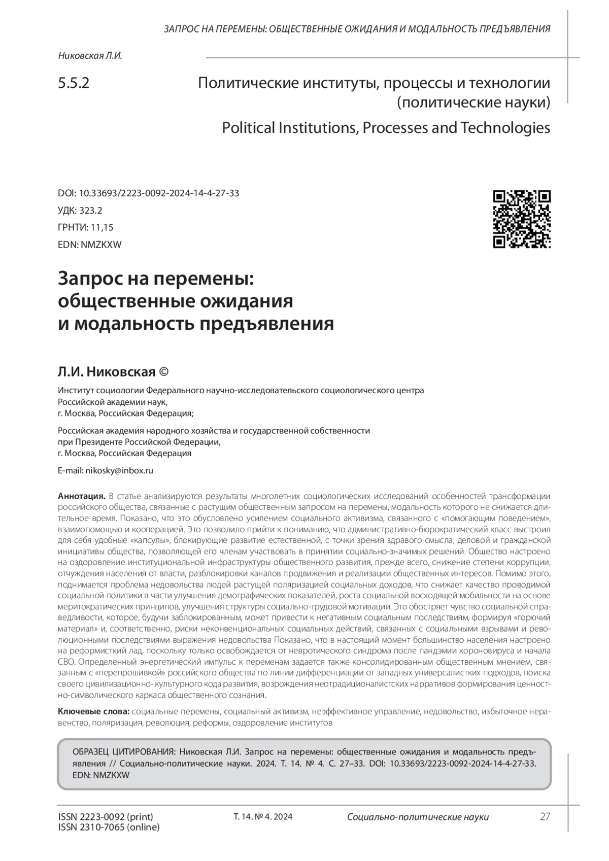 НИКОВСКАЯ Л. И. ЗАПРОС НА ПЕРЕМЕНЫ: ОБЩЕСТВЕННЫЕ ОЖИДАНИЯ И МОДАЛЬНОСТЬ ПРЕДЪЯВЛЕНИЯ // СОЦИАЛЬНО-ПОЛИТИЧЕСКИЕ НАУКИ. 2024. Т. 14 № 4
