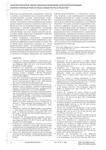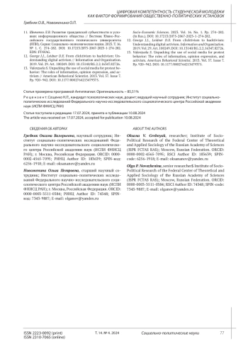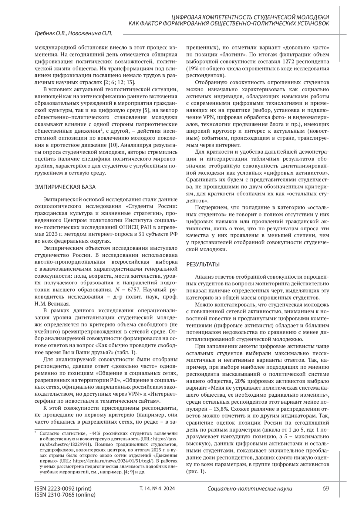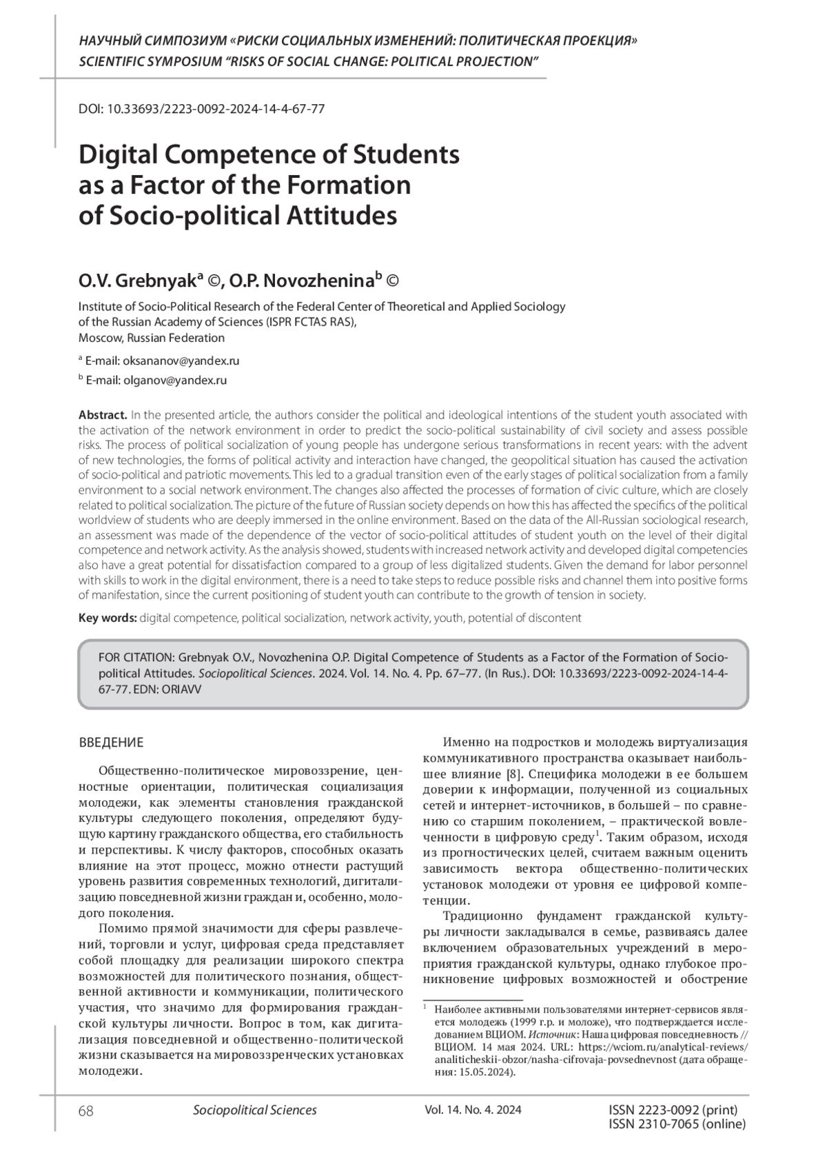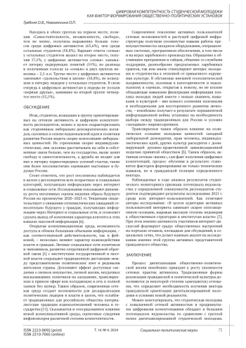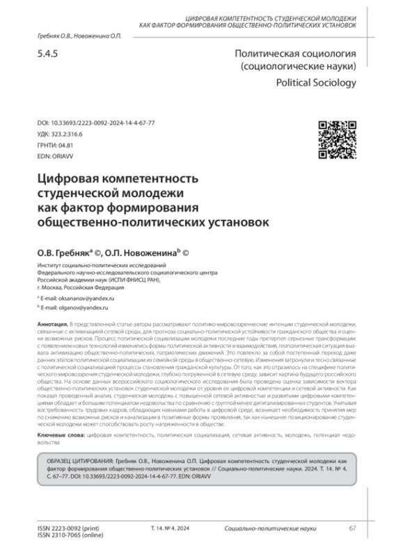ГРЕБНЯК О. В., НОВОЖЕНИНА О. П. ЦИФРОВАЯ КОМПЕТЕНТНОСТЬ СТУДЕНЧЕСКОЙ МОЛОДЕЖИ КАК ФАКТОР ФОРМИРОВАНИЯ ОБЩЕСТВЕННО-ПОЛИТИЧЕСКИХ УСТАНОВОК // СОЦИАЛЬНО-ПОЛИТИЧЕСКИЕ НАУКИ. 2024. Т. 14 № 4