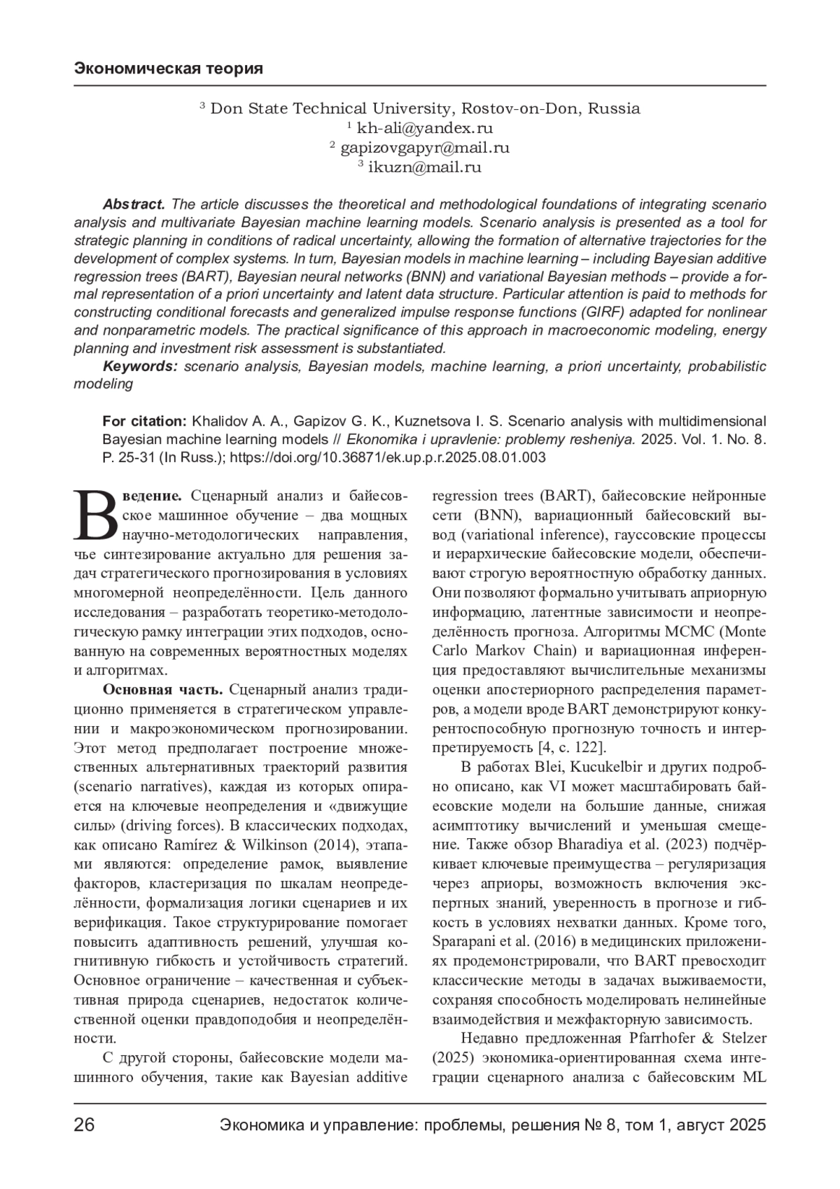 В статье рассматриваются теоретико-методологические основы интеграции сценарного анализа и многомерных байесовских моделей машинного обучения. Сценарный анализ представлен как инструмент стратегического планирования в условиях радикальной неопределённости, позволяющий формировать альтернативные траектории развития сложных систем. В свою очередь, байесовские модели в машинном обучении - в том числе Bayesian additive regression trees (BART), байесовские нейронные сети (BNN) и вариационные байесовские методы - обеспечивают формальное представление априорной неопределённости и латентной структуры данных. Особое внимание уделено методам построения условных прогнозов и обобщённых функций импульсного отклика (GIRF), адаптированным для нелинейных и непараметрических моделей. Обоснована практическая значимость данного подхода в макроэкономическом моделировании, энергетическом планировании и оценке инвестиционных рисков.