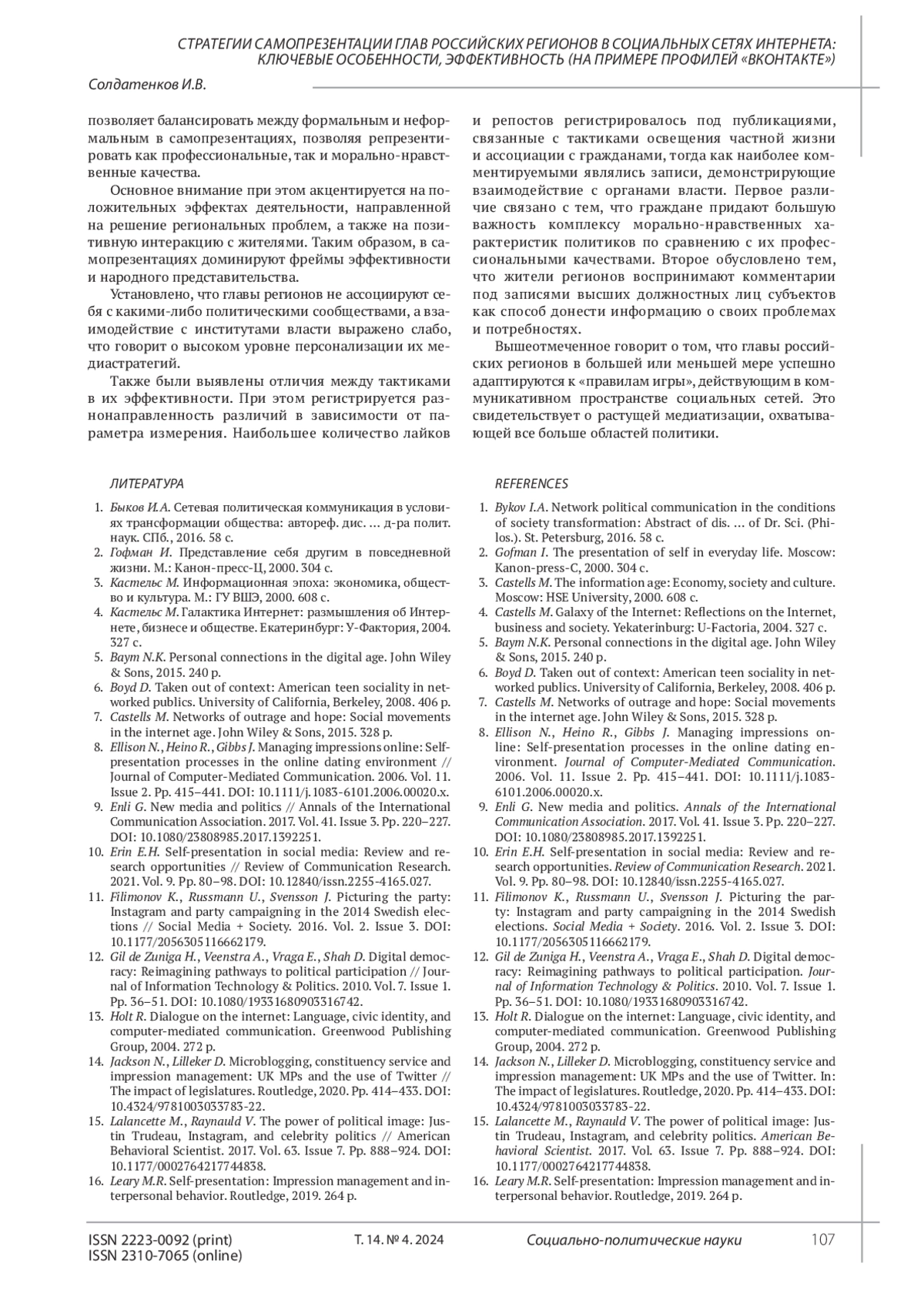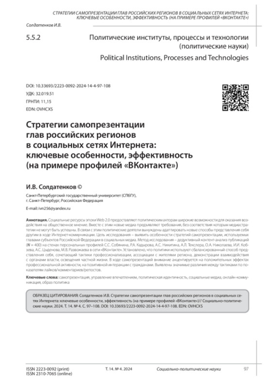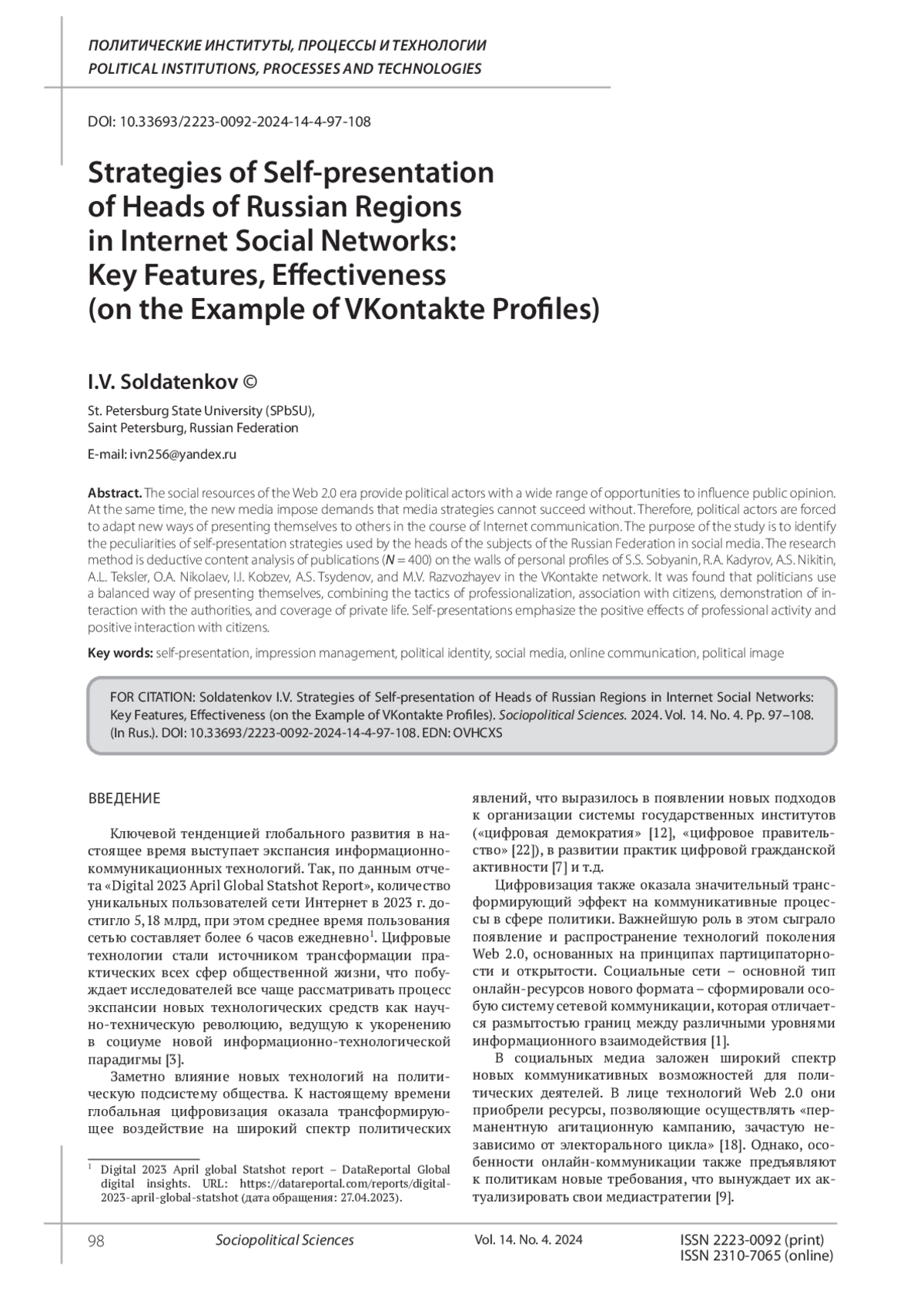 Социальные ресурсы эпохи Web 2.0 предоставляют политическим акторам широкие возможности для оказания воздействия на общественное мнение. Вместе с этим новые медиа предъявляют требования, без соответствия которым медиастратегии не могут быть успешны. В связи с этим политические деятели вынуждены адаптировать новые способы представления себя другим в ходе Интернет-коммуникации. Цель исследования - выявить особенности стратегий самопрезентации, используемых главами субъектов Российской Федерации в социальных медиа. Метод исследования - дедуктивный контент-анализ публикаций (N = 400) на стенах персональных профилей С. С. Собянина, Р. А. Кадырова, А. С. Никитина, А. Л. Текслера, О. А. Николаева, И. И. Кобзева, А. С. Цыденова, М. В. Развожаева в сети «ВКонтакте». Установлено, что политики используют сбалансированный способ представления себя, сочетающий тактики профессионализации, ассоциации с жителями региона, демонстрации взаимодействия с органами власти, освещения частной жизни. В ходе самопрезентаций внимание акцентируется на положительных эффектах профессиональной активности, на позитивной интеракции с гражданами. Выявлены значимые различия между тактиками по показателям лайков/комментариев/репостов.