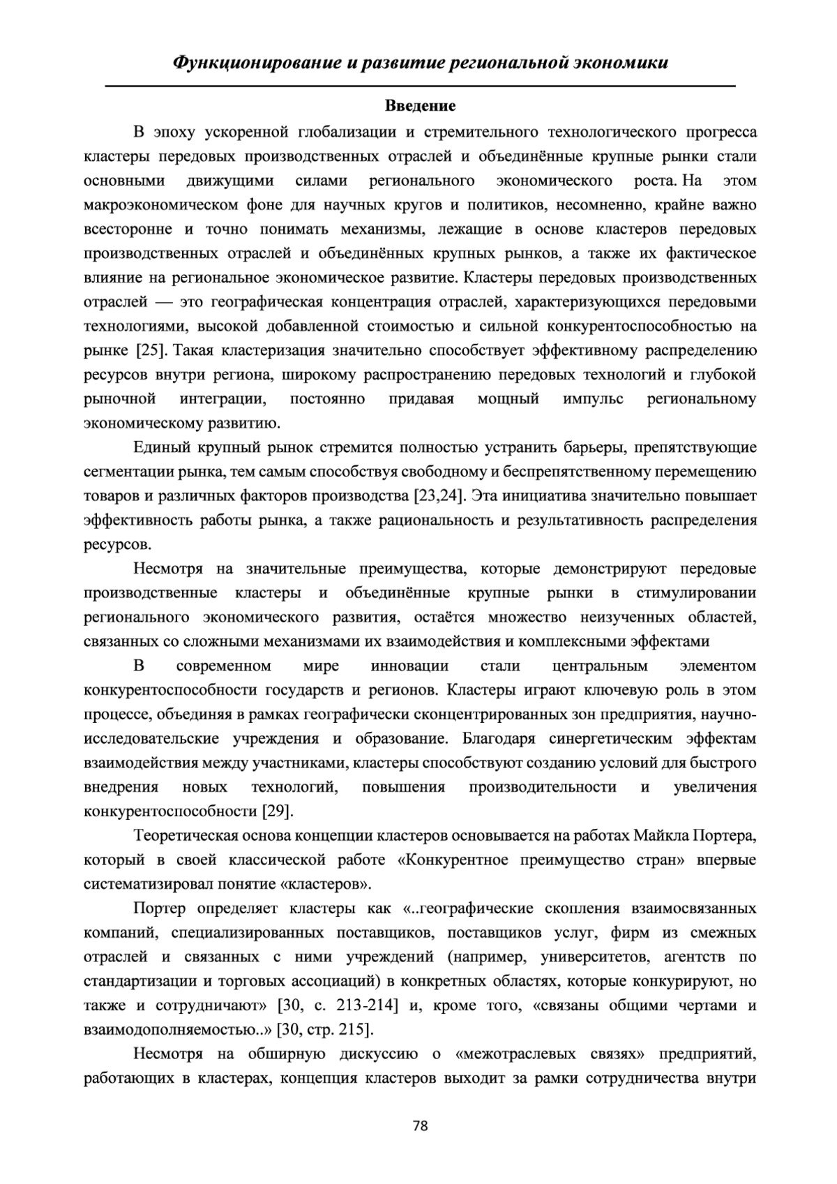 В статье проводится всесторонний анализ влияния передовых производственных кластеров и объединённых крупных рынков на региональное экономическое развитие в условиях ускоренной глобализации и трансформации технологических и экономических процессов. Кластеры представлены как географически локализованные системы взаимосвязанного взаимодействия предприятий, научно-исследовательских организаций и образовательных учреждений, вовлечённых в кооперацию и конкуренцию, что способствует генерации и диффузии инноваций, росту производительности и укреплению региональной конкурентоспособности. Теоретической основой исследования служат концепции кластеров, разработанные Майклом Портером, которые рассматривают географически сконцентрированные структуры как ключевые элементы достижения устойчивых конкурентных преимуществ. Освещается их роль в эффекте межотраслевой интеграции, эффективности распределения ресурсов и интенсификации технологических процессов посредством реализации синергетического потенциала. Кроме того, уделяется внимание функции объединённых рынков в устранении барьеров для перетока факторов производства и товаров, что значительно увеличивает эффективность функционирования региональных экономических систем. Несмотря на значительные достижения кластерного подхода, авторы подчёркивают недостаточную изученность ряда аспектов взаимодействия кластерных структур и объединённых рынков, а также комплексных эффектов, возникающих на их основе. Полученные выводы представляют значимость для дальнейшего изучения конкурентоспособности регионов, экономической интеграции и долгосрочной устойчивости территориального социально-экономического развития.