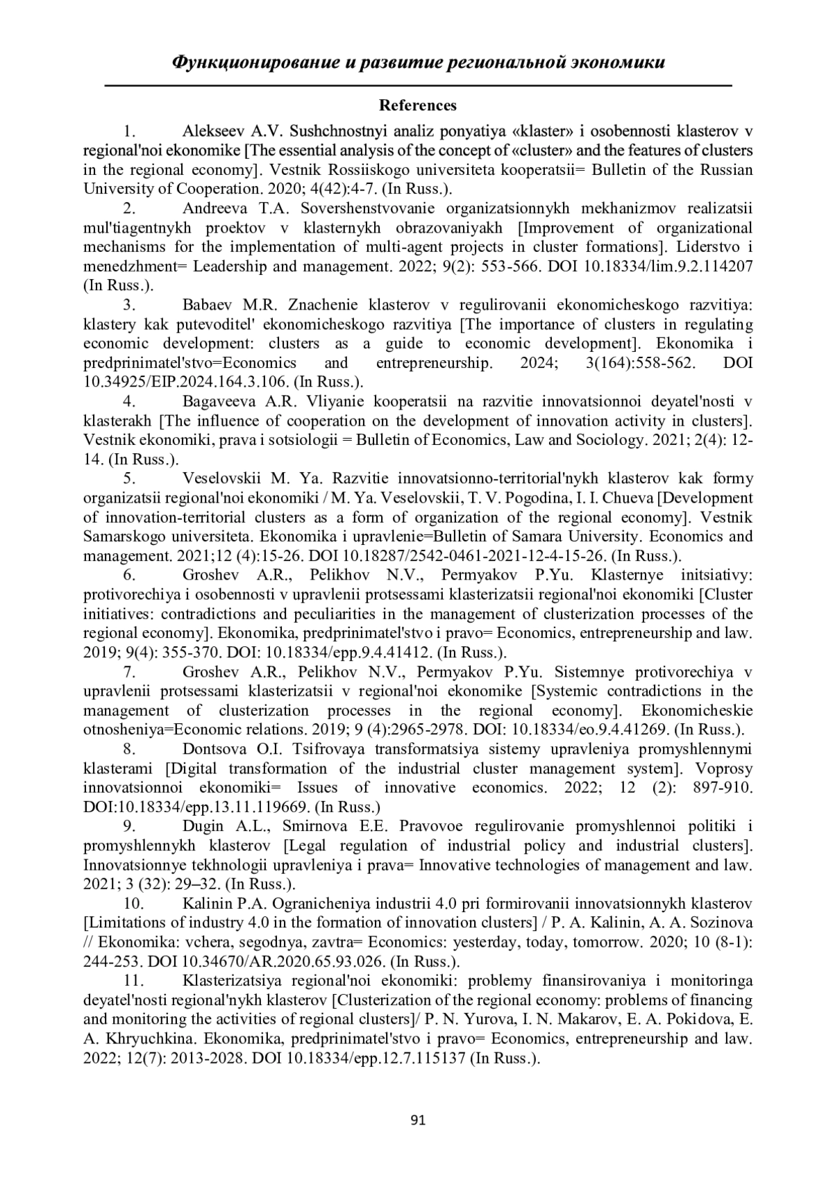 7. Грошев А.Р., Пелихов Н.В., Пермяков П.Ю. Системные противоречия в управлении процессами кластеризации в региональной экономике // Экономические отношения. 2019; 9 (4):2965-2978. DOI: 10.18334/eo.9.4.41269 EDN: MJEIQL