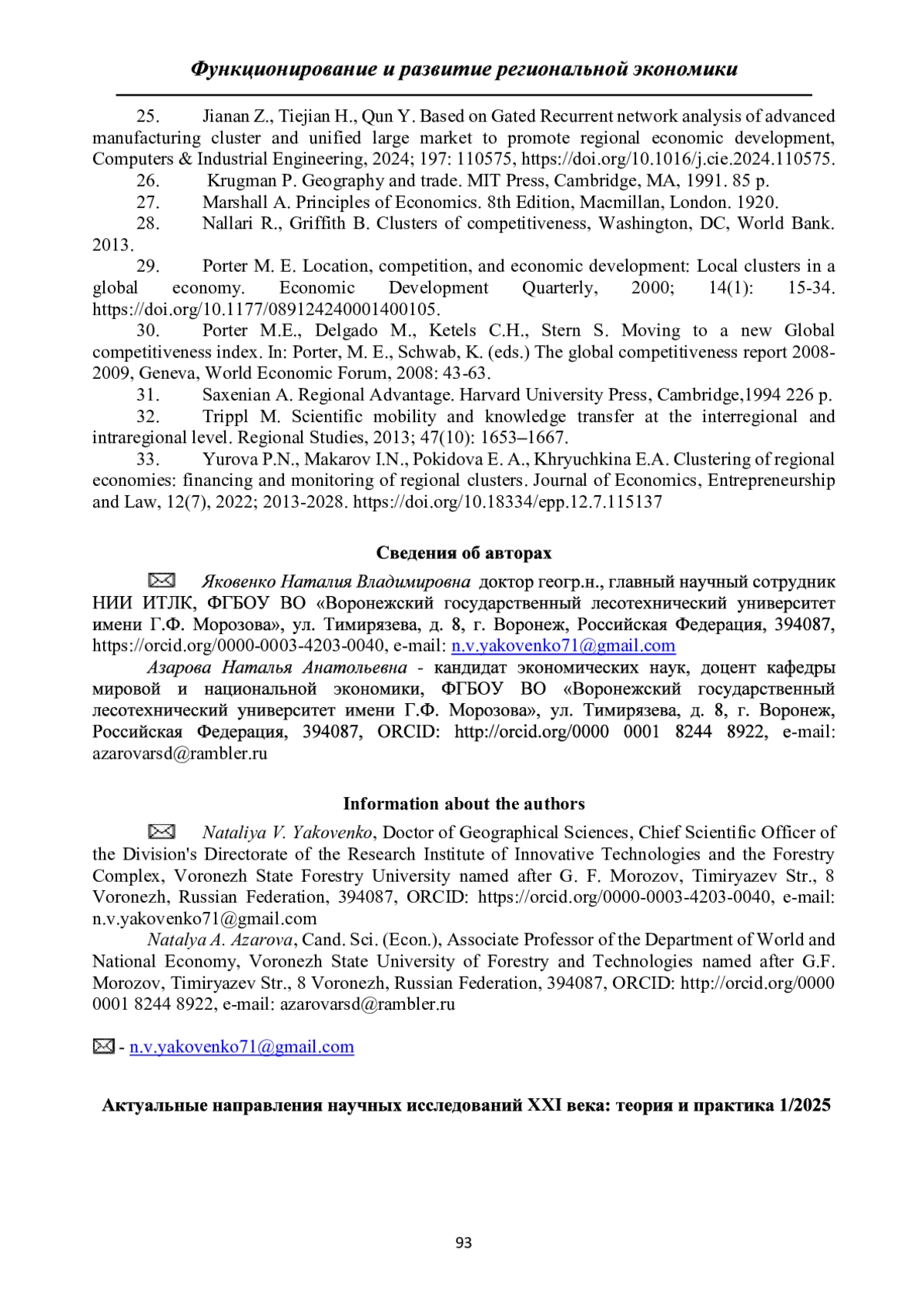 33. Yurova P.N., Makarov I.N., Pokidova E.A., Khryuchkina E.A. Clustering of regional economies: financing and monitoring of regional clusters. Journal of Economics, Entrepreneurship and Law, 2022; 12(7): 2013-2028. DOI: 10.18334/epp.12.7.115137 EDN: DFOLNL