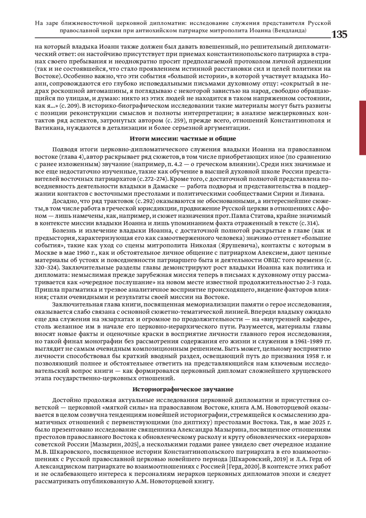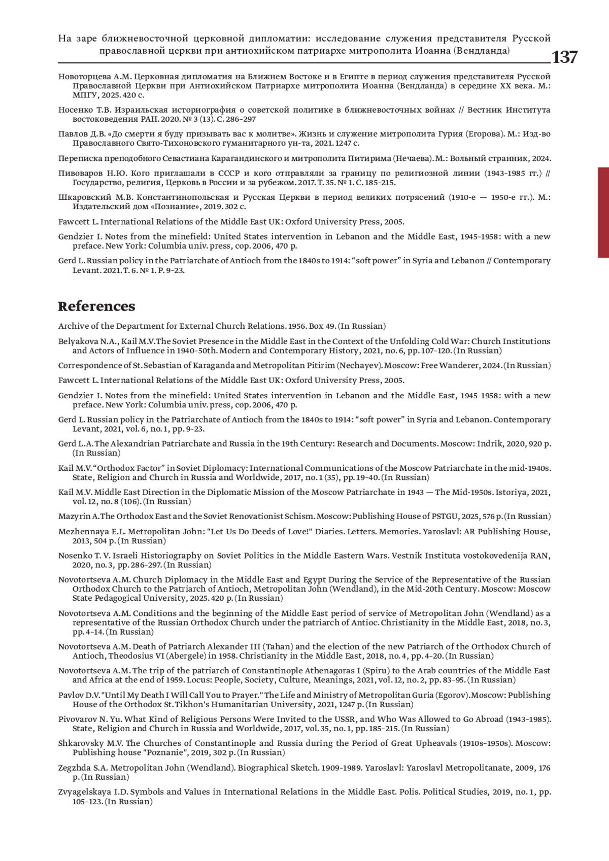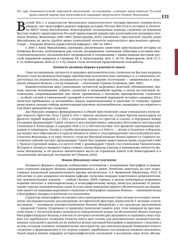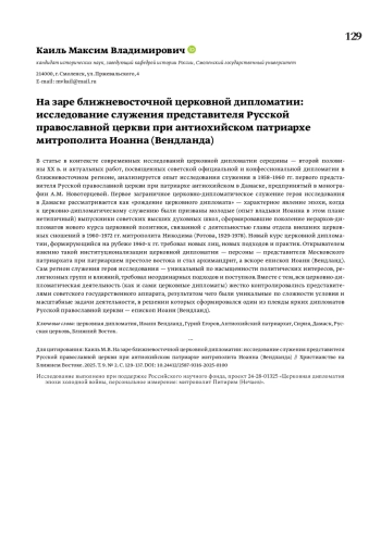 В статье в контексте современных исследований церковной дипломатии середины — второй половины ХХ в. и актуальных работ, посвященных советской официальной и конфессиональной дипломатии в ближневосточном регионе, анализируется опыт исследования служения в 1958–1960 гг. первого представителя Русской православной церкви при патриархе антиохийском в Дамаске, предпринятый в монографии А. М. Новоторцевой. Первое заграничное церковно-дипломатическое служение героя исследования в Дамаске рассматривается как «рождение церковного дипломата» — характерное явление эпохи, когда к церковно-дипломатическому служению были призваны молодые (опыт владыки Иоанна в этом плане нетипичный) выпускники советских высших духовных школ, сформировавшие поколение иерархов-дипломатов нового курса церковной политики, связанной с деятельностью главы отдела внешних церковных сношений в 1960–1972 гг. митрополита Никодима (Ротова, 1929-1978). Новый курс церковной дипломатии, формирующийся на рубеже 1960-х гг. требовал новых лиц, новых подходов и практик. Открывателем именно такой институционализации церковной дипломатии — персоны — представителя Московского патриархата при патриаршем престоле востока и стал архимандрит, а вскоре епископ Иоанн (Вендланд). Сам регион служения героя исследования — уникальный по насыщенности политических интересов, религиозных групп и влияний, требовал неординарных подходов и поступков. Вместе с тем, вся церковно-дипломатическая деятельность (как и сами церковные дипломаты) жестко контролировались представителями советского государственного аппарата, результатом чего были уникальные по сложности условия и масштабные задачи деятельности, в решении которых сформировался один из плеяды ярких дипломатов Русской православной церкви — епископ Иоанн (Вендланд).