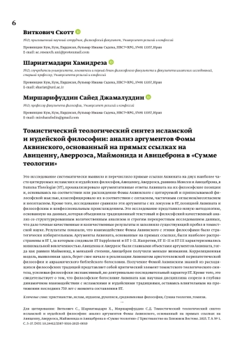 Средневековый схоластический период создал благоприятные условия для масштабного переводческого движения и научного обмена между христианскими, исламскими и иудейскими философами и теологами. В этом контексте в «Сумме теологии» Фома Аквинский (1225–1274 гг. н. э.) обращается к нехристианским мыслителям, в том числе к исламским философам Авиценне (ибн Сине) и Аверроэсу (ибн Рушду), а также к еврейским философам рабби Моисею (Маймониду) и Авиценброну (ибн Габиролу). Theologiæ (ST).1 В настоящем исследовании рассматривается то, как Фома Аквинский заимствовал, видоизменял, опровергал и интегрировал взгляды двух наиболее часто упоминаемых исламских и еврейских философов. Эти взгляды охватывают такие темы, как теология, ангелология, этика, христология, таинства, душа и эсхатология. Таким образом, исследование иллюстрирует частоту, распределение и характер аргументов Фомы Аквинского, основанных на прямых ссылках, в ST.