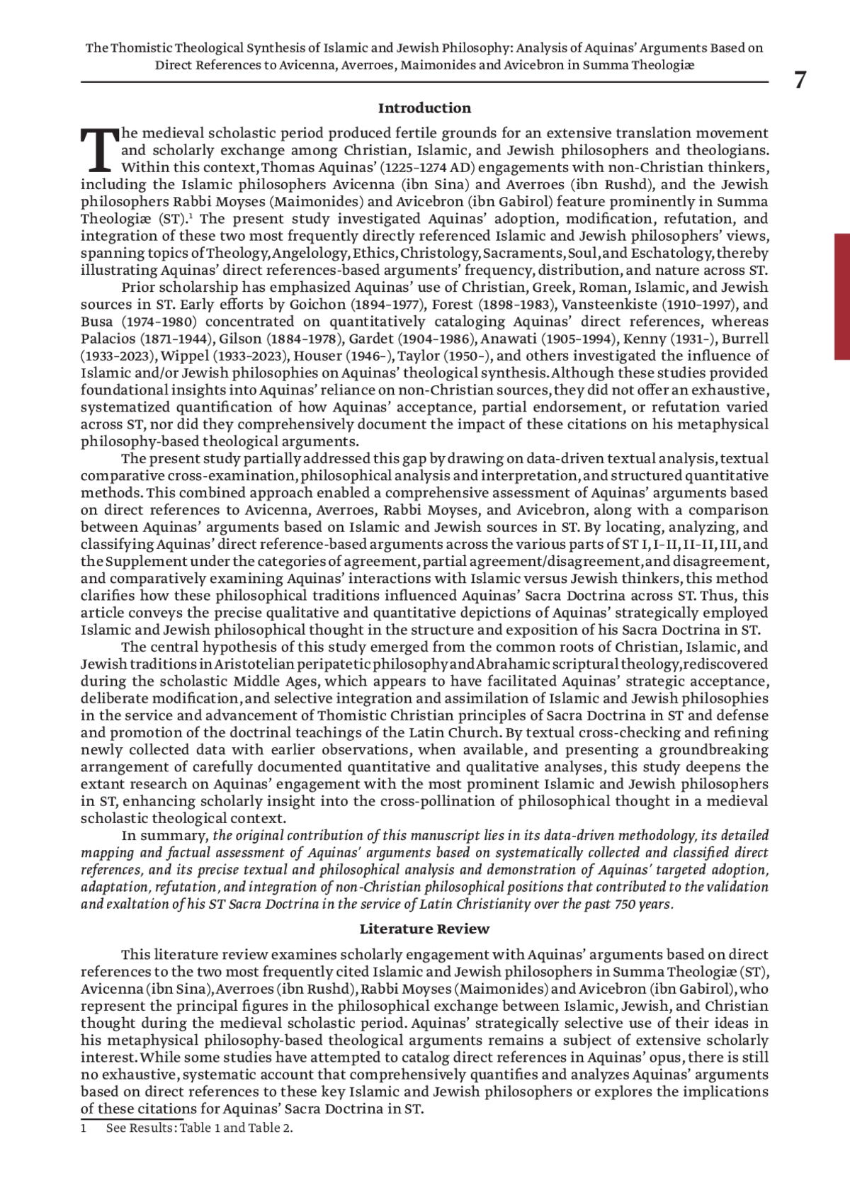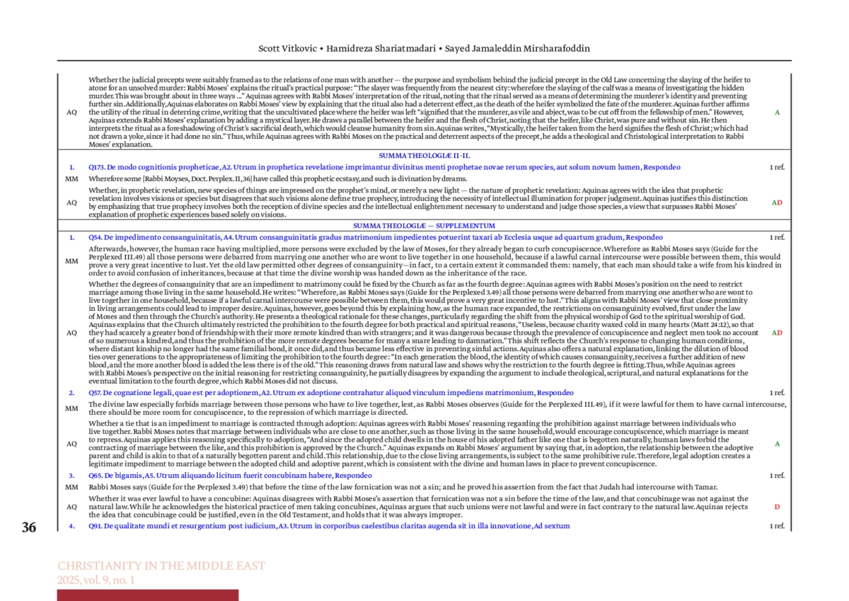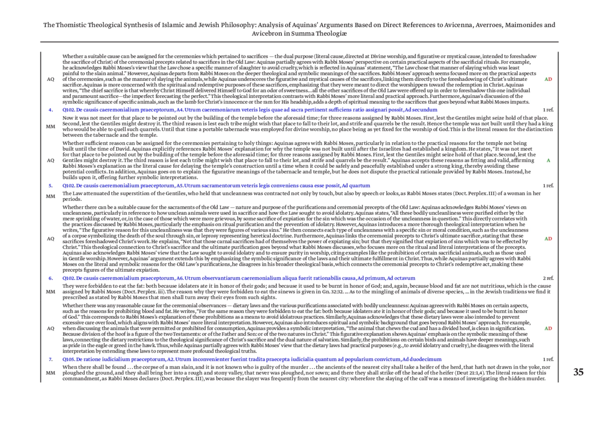 Это исследование систематически выявило и перечислило прямые ссылки Аквината на двух наиболее часто цитируемых исламских и иудейских философов, Авиценну, Аверроэса, раввина Моисея и Авицеброна, в Summa Theologiæ (ST), проанализировало аргументативные ответы Аквината на их философские позиции и, основываясь на соответствии или расхождении Фомы Аквинского с цитируемой и приписываемой философской мыслью, классифицировало их в соответствии с согласием, частичным согласием/несогласием и несогласием. Кроме того, исследование сравнило эти аргументы с их локусом в ST, позицией Аквината и философским и конфессиональным происхождением. Это исследование представило новую методологию, основанную на данных, которая объединила традиционный текстовый и философский качественный анализ со структурированным количественным анализом и строгим перекрестным исследованием данных, что дало точные качественные и количественные результаты и заполнило существующий пробел в томистской науке. Результаты показали, что взаимодействие Фомы Аквинского с этими философами было стратегически избирательным. Аргументы Аквината, основанные на прямых ссылках, были наиболее распространены в ST I, за которым следовали ST Supplement и ST I–II. Напротив, ST II–II и ST III характеризовались минимальной вовлеченностью. Авиценна и Аверроэс были главными объектами аргументов Аквината, тогда как раввин Маймонид, в меньшей степени, Авицеброн получили меньше внимания. Корреляционная модель, выявленная здесь, берет свое начало в реализации Аквинатом аристотелевской перипатетической философии и авраамического библейского богословия. Получение Фомой Аквинским знаний из расходящихся философских традиций представляет собой критический элемент томистского теологического синтеза, усиливая философски экспансивный, но доктринально последовательный характер ST. Кроме того, это свидетельствует о том, что философское богословие Аквината как научная дисциплина созрело в глубоко динамичном взаимодействии с исламскими и иудейскими традициями, оставаясь влиятельным на протяжении последних 750 лет с момента составления ST.