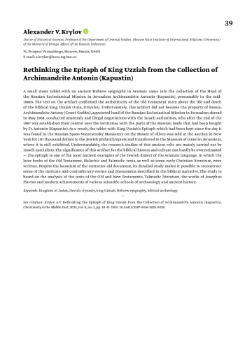Эта статья была задумана во время написания монографии об исторических связях Иерусалима и России [Крылов, Морозов, Федорченко, Шебалина, 2024]. Когда создавался раздел, посвящённый архимандриту Антонину (Капустину), главе Русской Духовной Миссии в Иерусалиме (1865–1894), меня заинтересовала история и судьба одного экспоната из его коллекции древностей — небольшая каменная табличка с древнееврейской эпиграфикой на арамейском языке, которая была найдена предположительно в середине 1880- х годов. Текст на скрижали подтверждал подлинность ветхозаветного предания о царе Иудеи Озии (Узия, Узияху). К сожалению, этот артефакт не стал достоянием России. Назначенный в мае 1968 г. начальником Русской Духовной Миссии в Иерусалиме от РПЦЗ архимандрит Антоний (граф Граббе) провел неблаговидные, если не сказать — преступные переговоры с израильскими властями, которые по окончании войны 1967 г. установили свой контроль над территориями, где размещалась часть русских участков, приобретенных о. Антонином. В результате табличка царя Озии, хранившаяся со дня ее обретения в русском Спасо-Вознесенском монастыре на Елеоне, оказалась в Нью-Йорке и была продана на аукционе за 150 тысяч долларов еврейским меценатам и передана в Музей Израиля в Иерусалиме, где находится поныне. Понятно, что изучением этой древней реликвии занимаются в основном израильские специалисты. Значение этого артефакта для библейской истории и культуры трудно переоценить — эпитафия с упоминанием имени потомка царя Давида относится к числу наиболее древних образчиков еврейского диалекта арамейского языка, на котором написаны поздние книги Ветхого завета, галахические и талмудические тексты, а также некоторая раннехристианская литература. Несмотря на лаконизм многовекового документа, его детальное изучение позволяет восстановить некоторые замысловатые и противоречивые события и явления, изложенные в библейском повествовании. Исследование основывается на анализе текстов Ветхого и Нового Заветов, талмудической литературы, произведений И. Флавия, современных достижений разных научных школ археологии и древней истории.