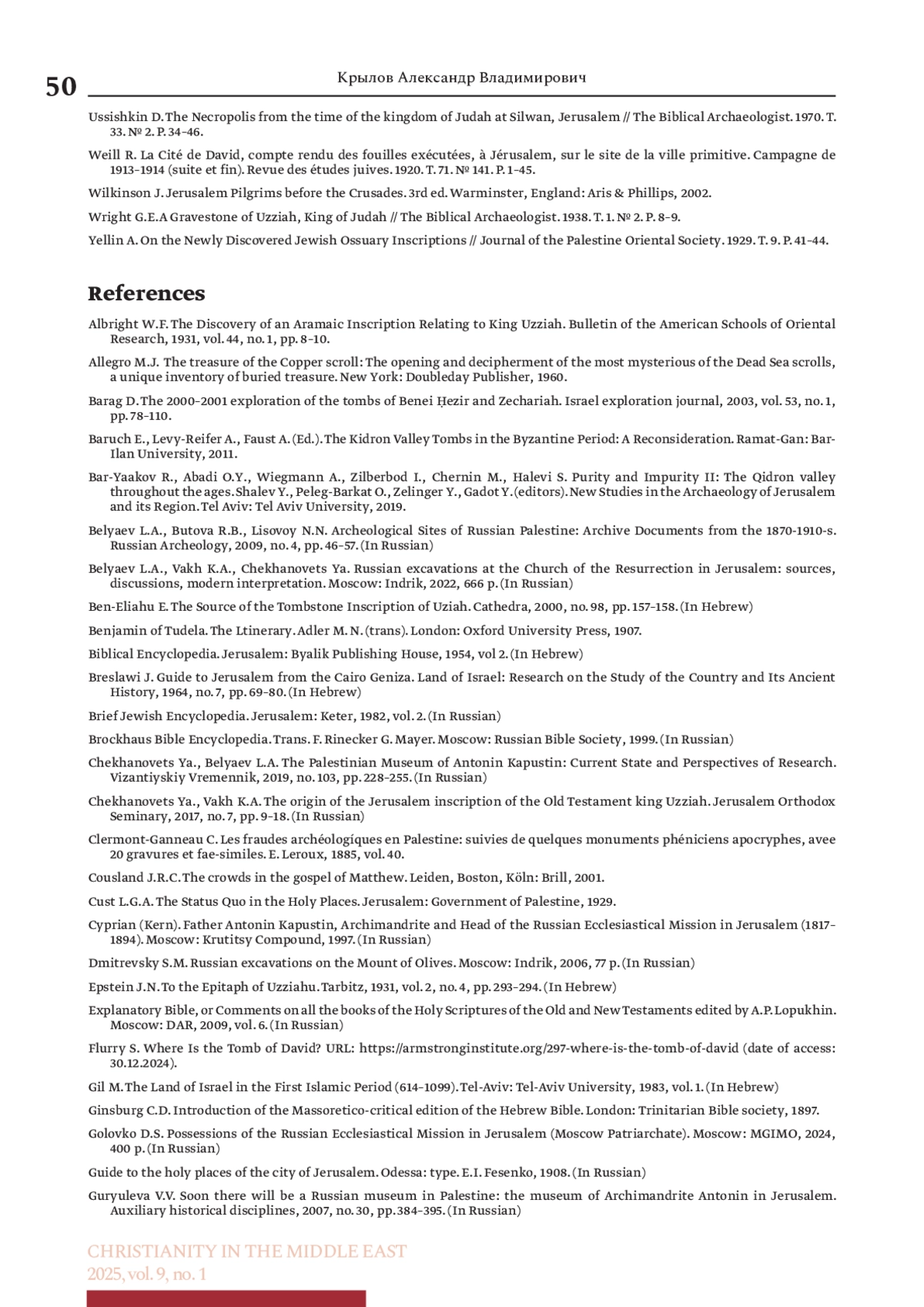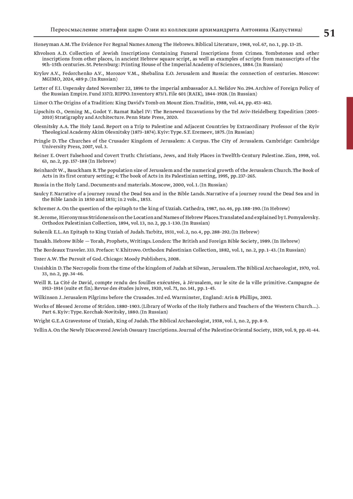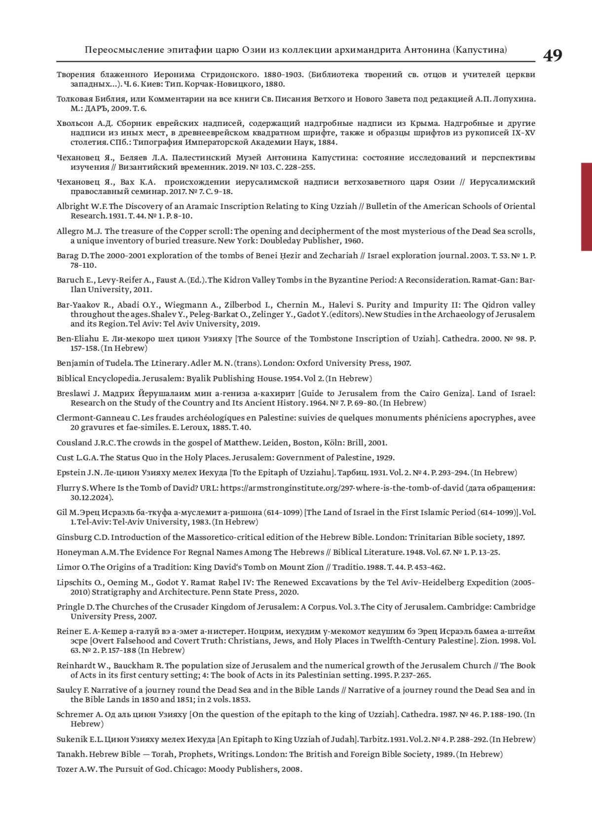 44. Schremer A. Од аль циюн Узияху [On the question of the epitaph to the king of Uzziah]. Cathedra. 1987. № 46. P. 188-190. (In Hebrew).