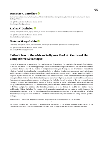 Статья посвящена выявлению условий и определению тенденций распространения католицизма в странах Африки. В качестве методологической рамки исследования выступает маркетинговая парадигма. С опорой на «ромб Портера» определены факторы конкурентных преимуществ религий: спрос и религиозный «капитал» (совокупность знаний человека о религиозных ритуалах, доктринах, сакральных текстах), миссионерская деятельность, предложение религии, активность государства (от полного невмешательства до жесткого контроля над деятельностью религиозных организаций), действие случая. Рассматривается влияние каждого фактора на формирование конкурентных стратегий католицизма в рамках локальных и регионального рынка религий Африки. Определено, что несмотря на рост числа приверженцев, католическая Церковь Африки в XXI в. проходит через сложный и противоречивый процесс поиска своего места в глобальном католицизме, одновременно сталкивается с обострением конкуренции на рынках религий. Вызов католицизму на континенте бросают пятидесятническое движение, афрохристианские церкви, а также ислам. Выявлено, что не менее серьезные проблемы перед католиками Африки ставят процессы либерализации вероучения и практики, инициированные после вступления на Римскую кафедру в 2013 г. Папы Франциска. Консервативно настроенная африканская паства оказалась не готовой положительно воспринять предложения Римской курии. Африканским католикам, религиозный «капитал» которых сформировался в результате синтеза традиционных религиозных убеждений и живого библейского духовного наследия, оказались чужды либеральные ценности современного Запада. Можно утверждать, что именно учет факторов конкурентных преимуществ на рынке религий Африки определит будущее католической Церкви.
