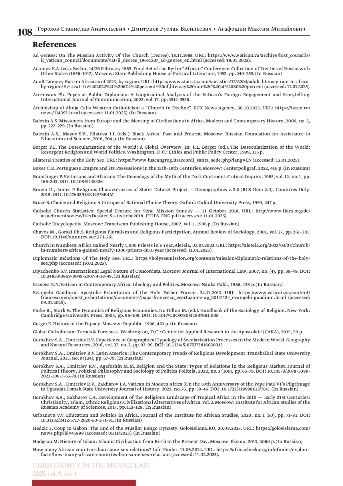 10. Горохов С.А., Дмитриев Р.В., Захаров И.А. Ватикан в современной Африке (к 50-летию визита в Уганду папы римского Павла VI) // Вестник Томского государственного университета. История. 2022. № 76. С. 38-46. DOI: 10.17223/19988613/76/5