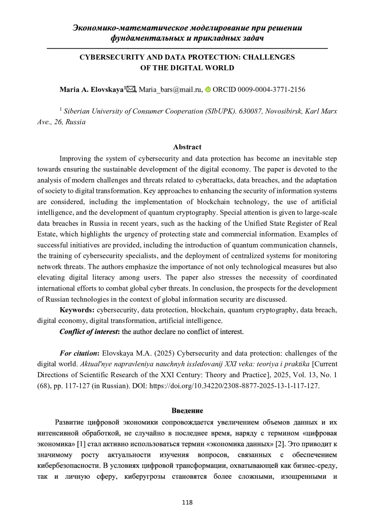 Улучшение системы кибербезопасности и защиты данных становится неизбежным шагом для обеспечения устойчивого развития цифровой экономики. Работа посвящена анализу современных вызовов и угроз, связанных с кибератаками, утечками данных и адаптацией общества к цифровой трансформации. Рассмотрены ключевые направления повышения безопасности информационных систем, включая внедрение блокчейна, использование технологий искусственного интеллекта и развитие квантовой криптографии. Особое внимание автором в статье уделено масштабным утечкам данных в России за последние годы, включая взлом Единого государственного реестра недвижимости, что подчеркивает остроту проблемы защиты государственной и коммерческой информации. Приводятся примеры успешных инициатив, таких как внедрение квантовых каналов связи, обучение специалистов в области кибербезопасности и применение централизованных систем мониторинга сетевых угроз. Автор подчеркивают важность не только технологического обеспечения, но и повышения цифровой грамотности пользователей. Также в статье сделан акцент на необходимости согласованных международных усилий в борьбе с глобальными киберугрозами. В заключении обсуждаются перспективы развития российских технологий в контексте глобальной информационной безопасности.