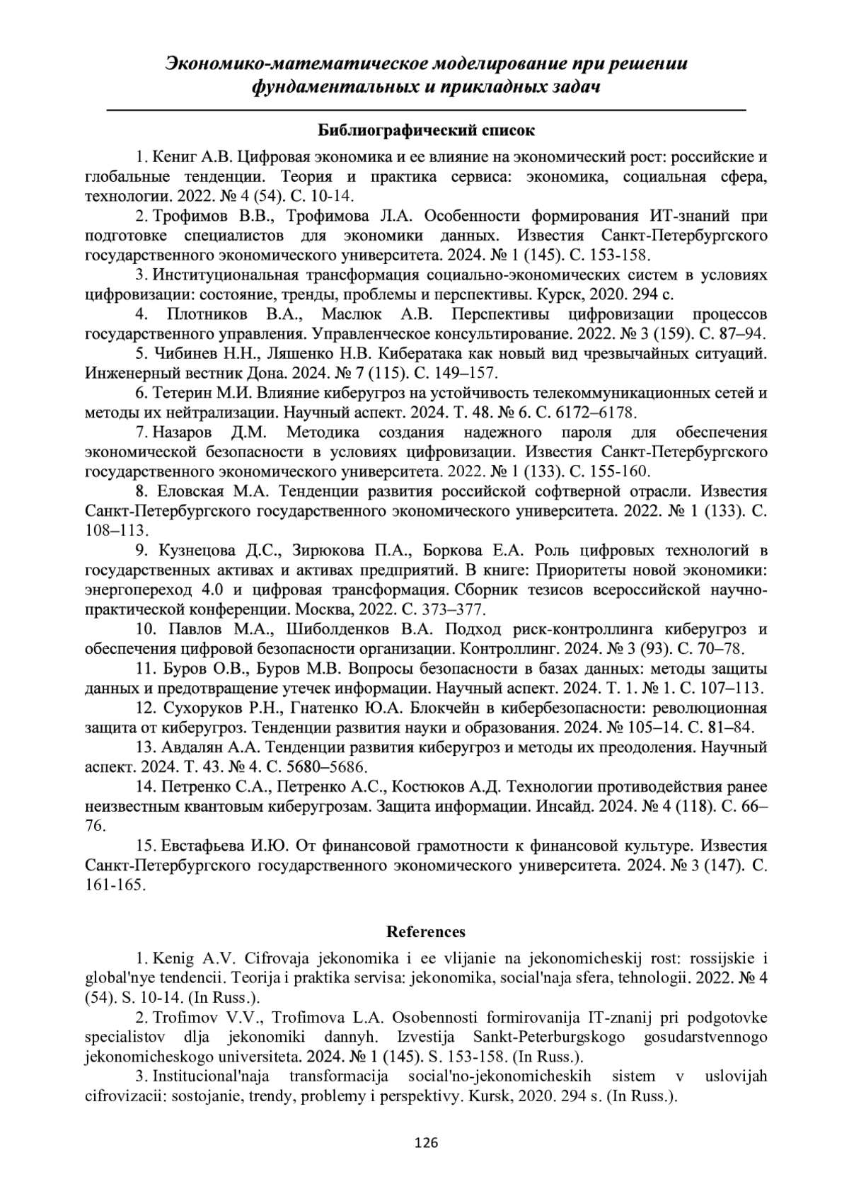 7. Назаров Д.М. Методика создания надежного пароля для обеспечения экономической безопасности в условиях цифровизации. Известия Санкт-Петербургского государственного экономического университета. 2022. № 1 (133). С. 155-160. EDN: JNFFUE