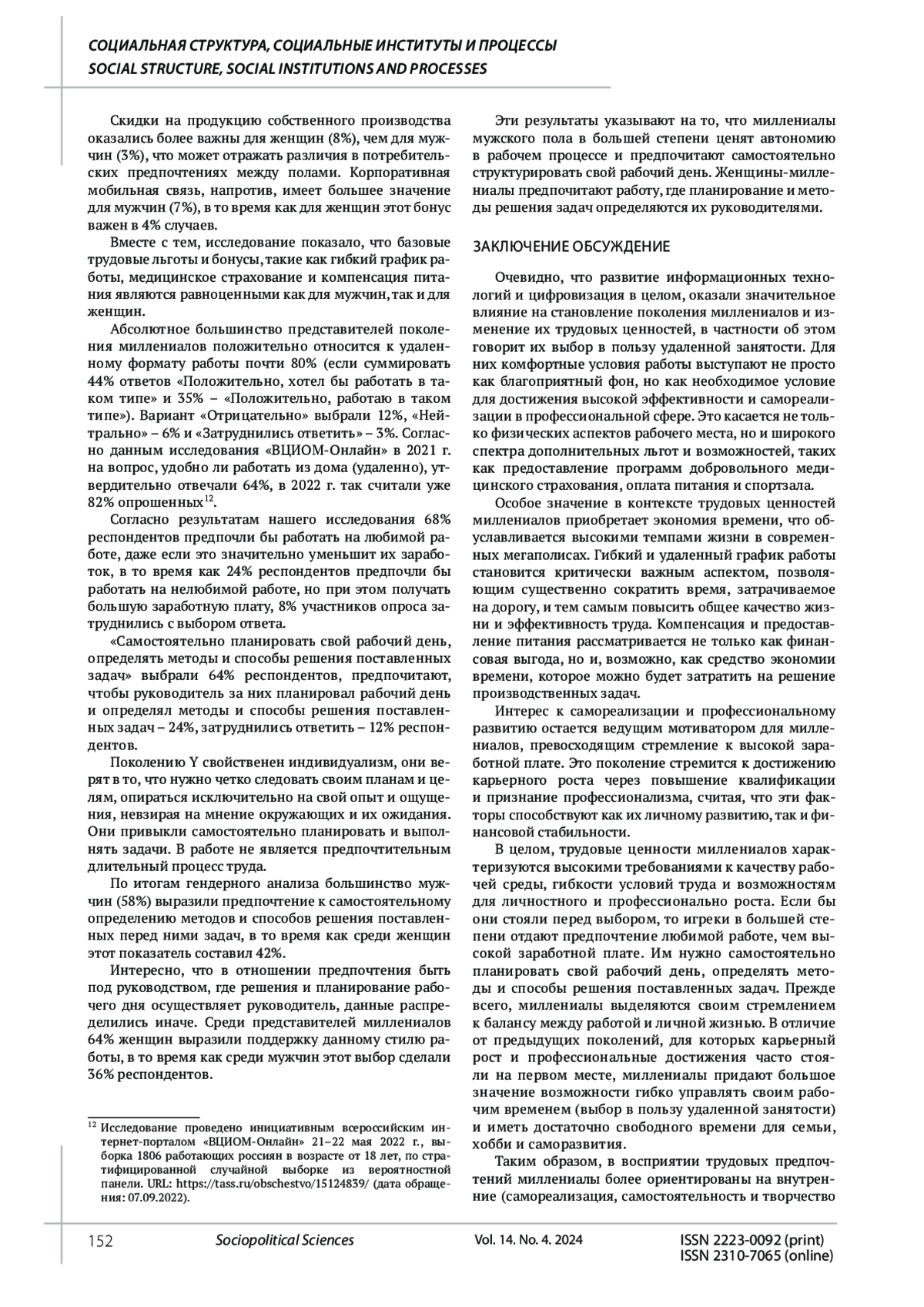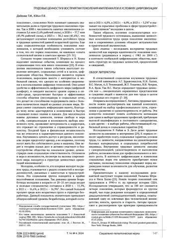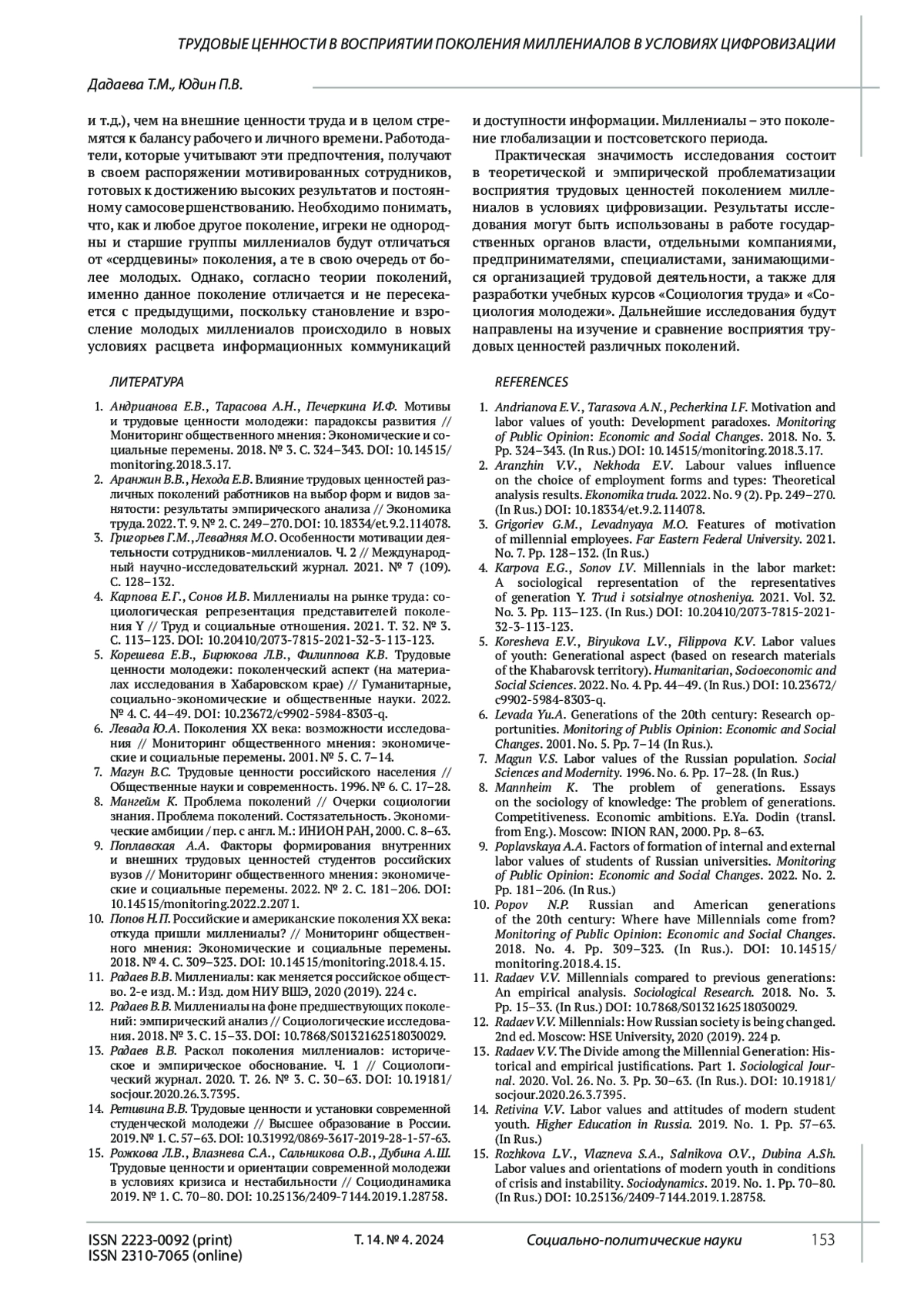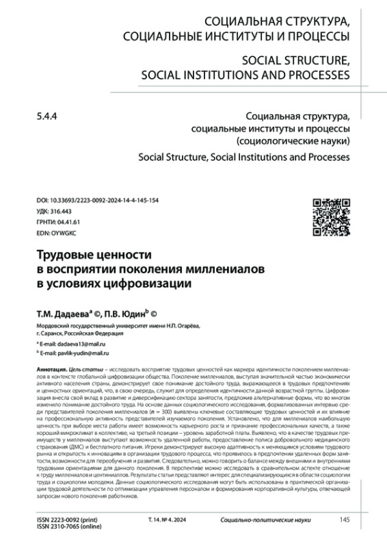 Цель статьи - исследовать восприятие трудовых ценностей как маркера идентичности поколением миллениалов в контексте глобальной цифровизации общества. Поколение миллениалов, выступая значительной частью экономически активного населения страны, демонстрирует свое понимание достойного труда, выражающееся в трудовых предпочтениях и ценностных ориентаций, что, в свою очередь, служит для определения идентичности данной возрастной группы. Цифровизация внесла свой вклад в развитие и диверсификацию сектора занятости, предложив альтернативные формы, что во многом изменило понимание достойного труда. На основе данных социологического исследования, формализованных интервью среди представителей поколения миллениалов (n = 300) выявлены ключевые составляющие трудовых ценностей и их влияние на профессиональную активность представителей изучаемого поколения. Установлено, что для миллениалов наибольшую ценность при выборе места работы имеет возможность карьерного роста и признание профессиональных качеств, а также хороший микроклимат в коллективе, на третьей позиции - уровень заработной платы. Выявлено, что в качестве трудовых преимуществ у миллениалов выступают возможность удаленной работы, предоставление полиса добровольного медицинского страхования (ДМС) и бесплатного питания. Игреки демонстрируют высокую адаптивность к меняющимся условиям трудового рынка и открытость к инновациям в организации трудового процесса, что проявилось в предпочтении удаленных форм занятости, возможности для переобучения и развития. Следовательно, можно говорить о балансе между внешними и внутренними трудовыми ориентациями для данного поколения. В перспективе можно исследовать в сравнительном аспекте отношение к труду миллениалов и центиниаллов. Результаты статьи представляют интерес для специализирующихся в области социологии труда и социологии молодежи. Данные социологического исследования могут быть использованы в практической организации трудовой деятельности по оптимизации управления персоналом и формирования корпоративной культуры, отвечающей запросам нового поколения работников.
