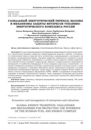 6. Гулиев И. А. Стратегическая технологическая адаптация России к глобальному энергетическому переходу: анализ сектора традиционной энергетики // Страховое дело. 2024. № 7 (376). С. 12-20. EDN: QSKTAM