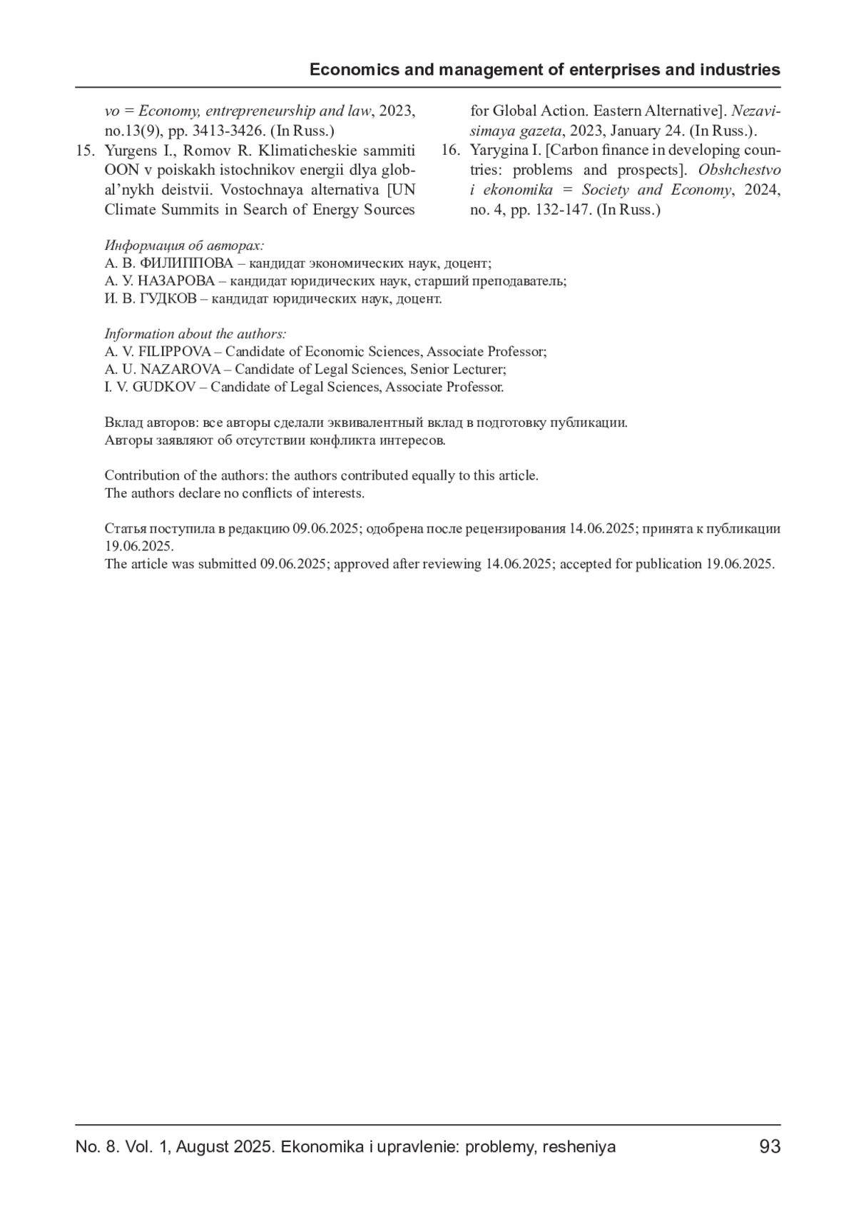 16. Ярыгина И. Углеродное финансирование в развивающихся странах: проблемы и перспективы // Общество и экономика. 2024. № 4. С. 132-147. EDN: AFZWNF