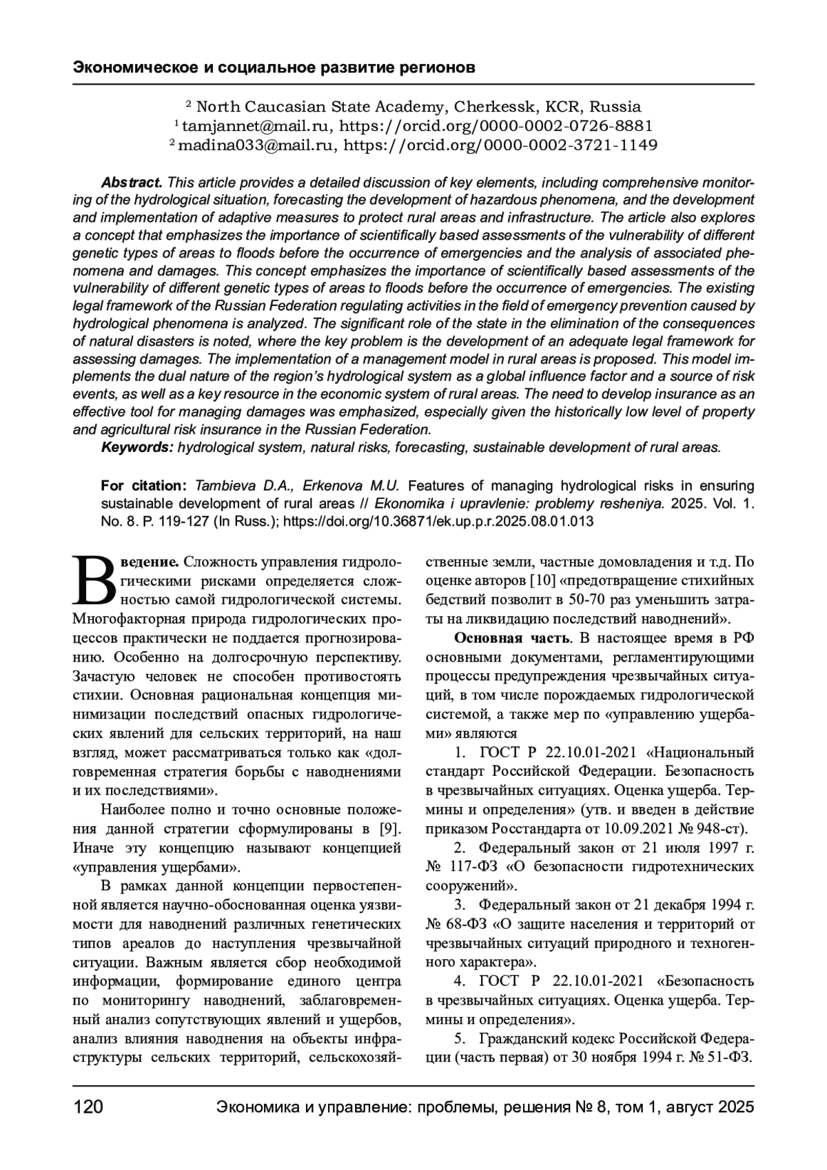 В данной статье подробно рассматриваются ключевые элементы, включающие комплексный мониторинг гидрологической обстановки, прогнозирование развития опасных явлений, разработку и реализацию адаптивных мер по защите сельских территорий и инфраструктуры. Рассмотрена концепция, акцентирующая внимание на научно-обоснованной оценке уязвимости территорий к наводнениям различных генетических типов до наступления чрезвычайных ситуаций и анализа сопутствующих явлений и ущербов. В рамках данной концепции первостепенной является научно-обоснованная оценка уязвимости для наводнений различных генетических типов ареалов до наступления чрезвычайной ситуации. Проанализирована существующая нормативно-правовая база Российской Федерации, регламентирующая деятельность в области предупреждения чрезвычайных ситуаций, порождаемых гидрологическими явлениями. Отмечается значительная роль государства в ликвидации последствий стихийных бедствий, где ключевой является проблема разработки адекватной правовой базы для оценки ущербов. Предложена реализация модели управления на сельских территориях. В данной модели реализована двойственная природа гидрологической системы региона как глобальный фактор влияния - источник рисковых событий и как ключевой ресурс в экономической системе сельских территорий. Подчеркнута необходимость развития страхования как эффективного инструмента управления ущербами, особенно учитывая исторически низкий уровень страхования имущества и сельскохозяйственных рисков в Российской Федерации.