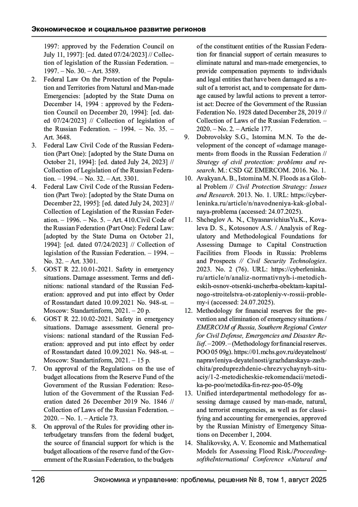 11. Щеглов А. Н., Чяснавичюс Ю. К., Ковалева Д. С., Котосонов А. С./ Анализ нормативных и методических основ оценки ущерба объектам капитального строительства от затоплений в России: проблемы и перспективы // Технологии гражданской безопасности. 2023. №2 (76). URL: https://cyberleninka.ru/article/n/analiz-normativnyh-i-metodicheskih-osnov-otsenki-uscherba-obektam-kapitalnogo-stroitelstva-ot-zatopleniy-v-rossii-problemy-i (дата обращения: 24.07.2025). EDN: USVAJF