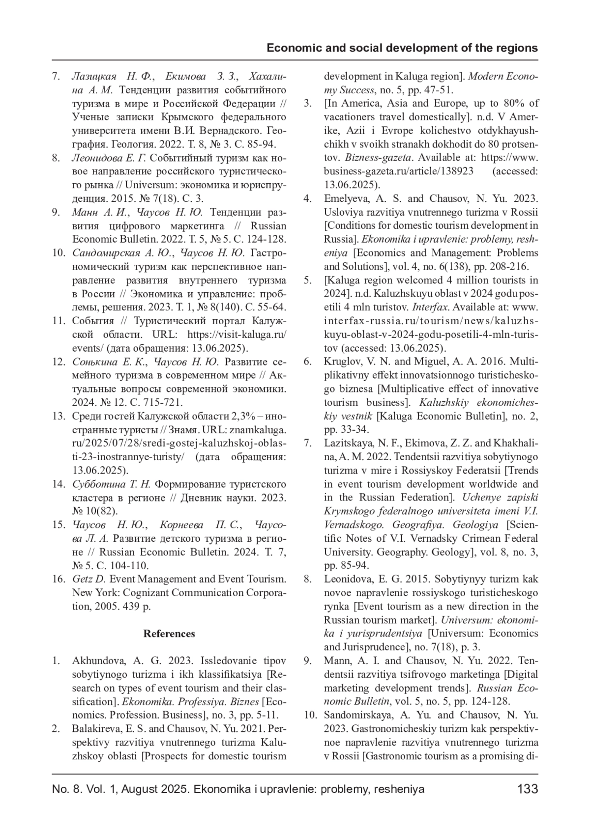 15. Чаусов Н. Ю., Корнеева П. С., Чаусова Л. А. Развитие детского туризма в регионе // Russian Economic Bulletin. 2024. Т. 7, № 5. С. 104-110. EDN: UYCAEM