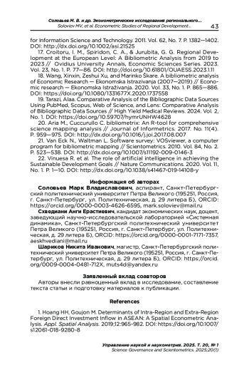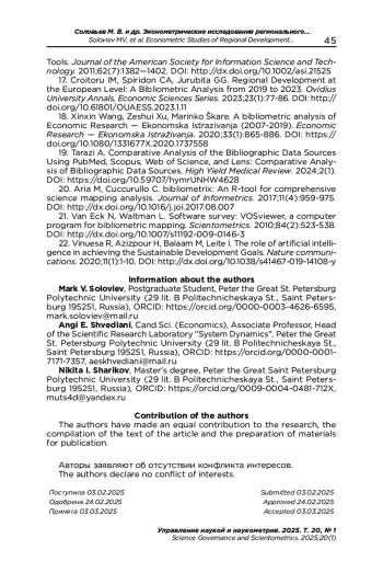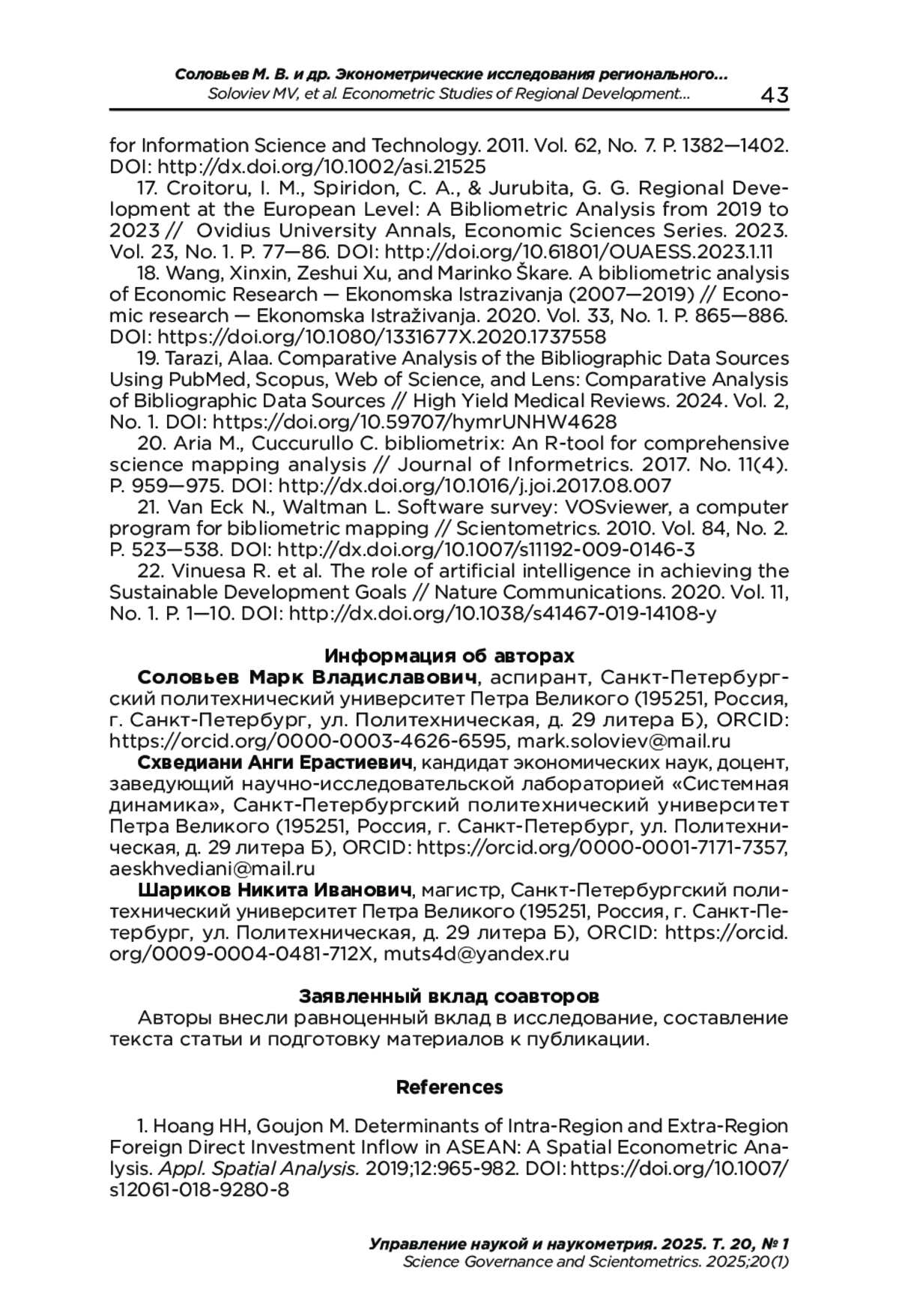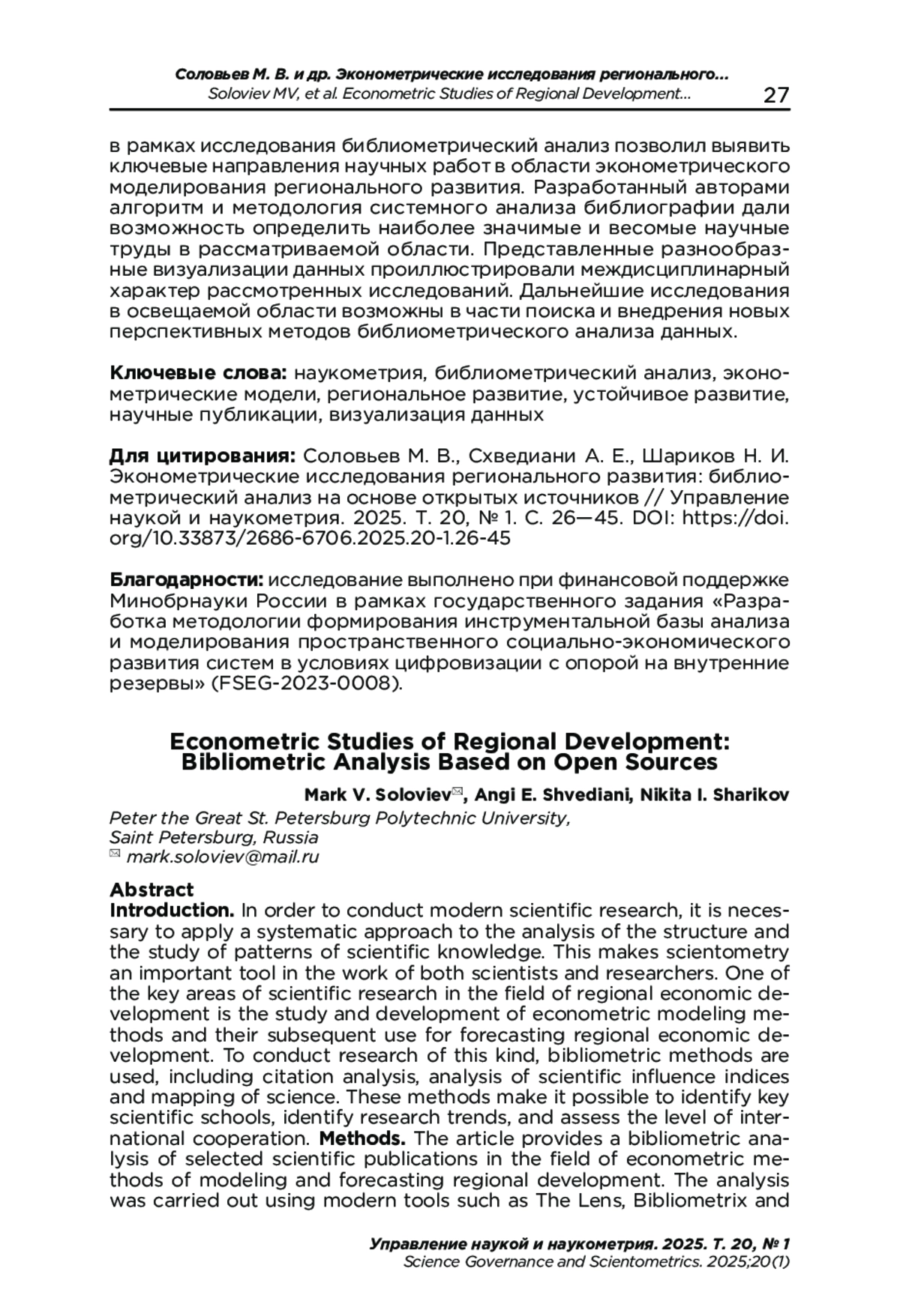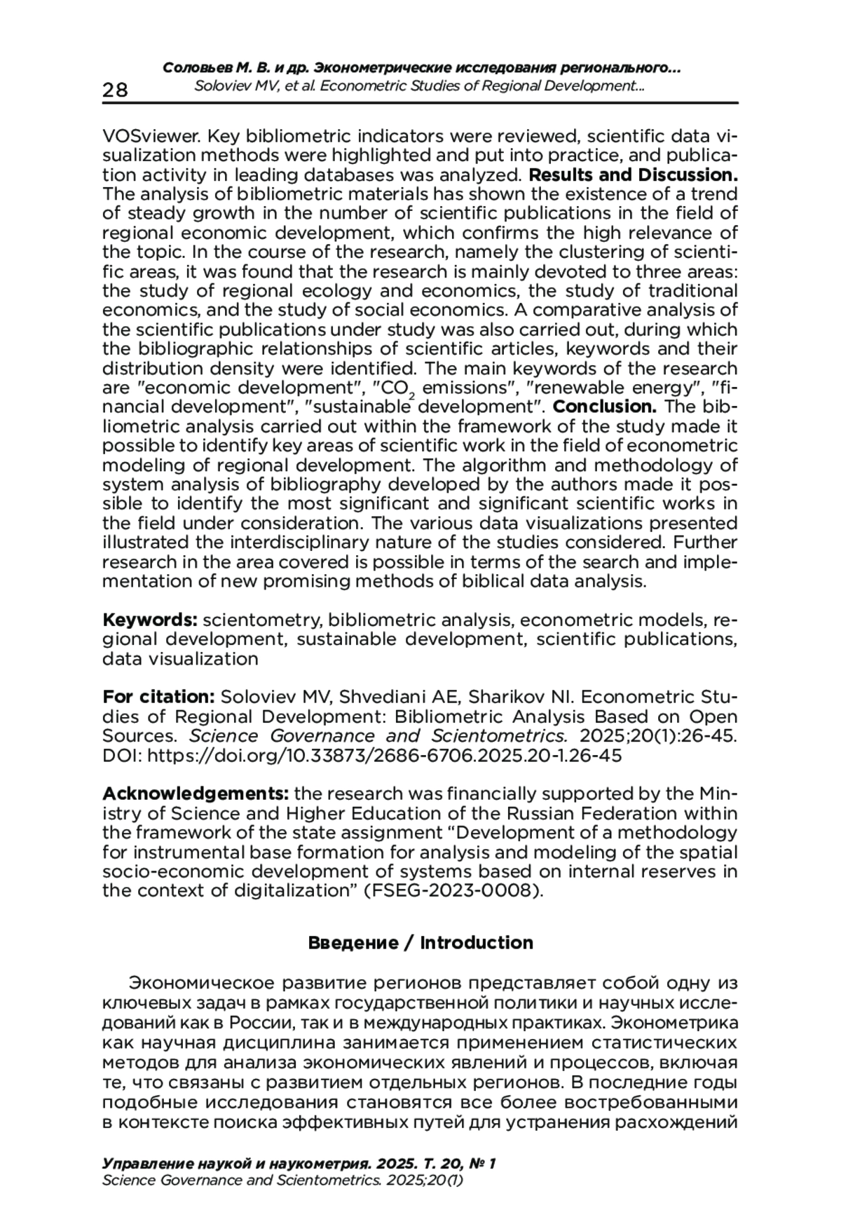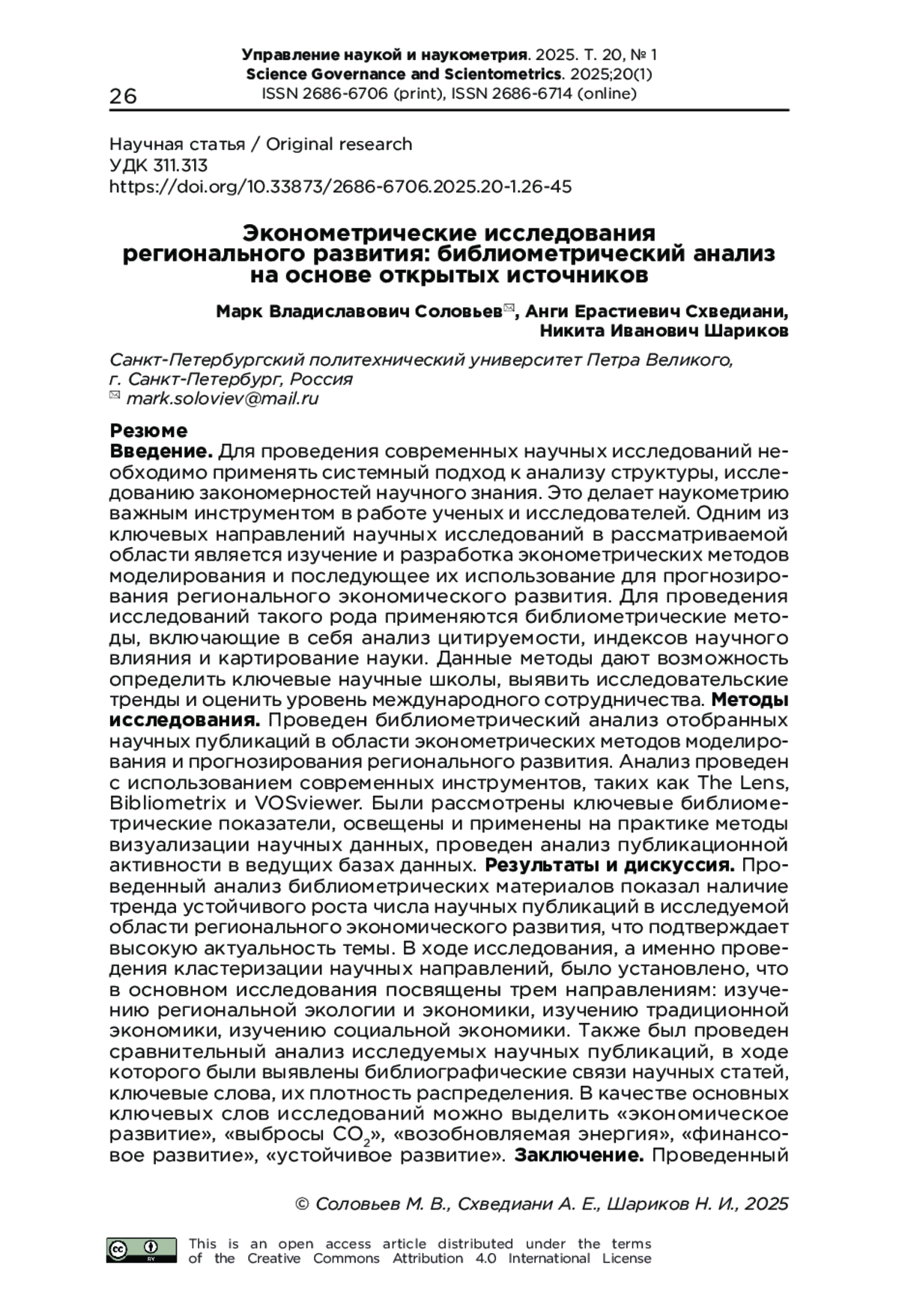 СОЛОВЬЁВ М. В., СХВЕДИАНИ А. Е., ШАРИКОВ Н. И. ЭКОНОМЕТРИЧЕСКИЕ ИССЛЕДОВАНИЯ РЕГИОНАЛЬНОГО РАЗВИТИЯ: БИБЛИОМЕТРИЧЕСКИЙ АНАЛИЗ НА ОСНОВЕ ОТКРЫТЫХ ИСТОЧНИКОВ // УПРАВЛЕНИЕ НАУКОЙ И НАУКОМЕТРИЯ. 2025. Т. 20 № 1