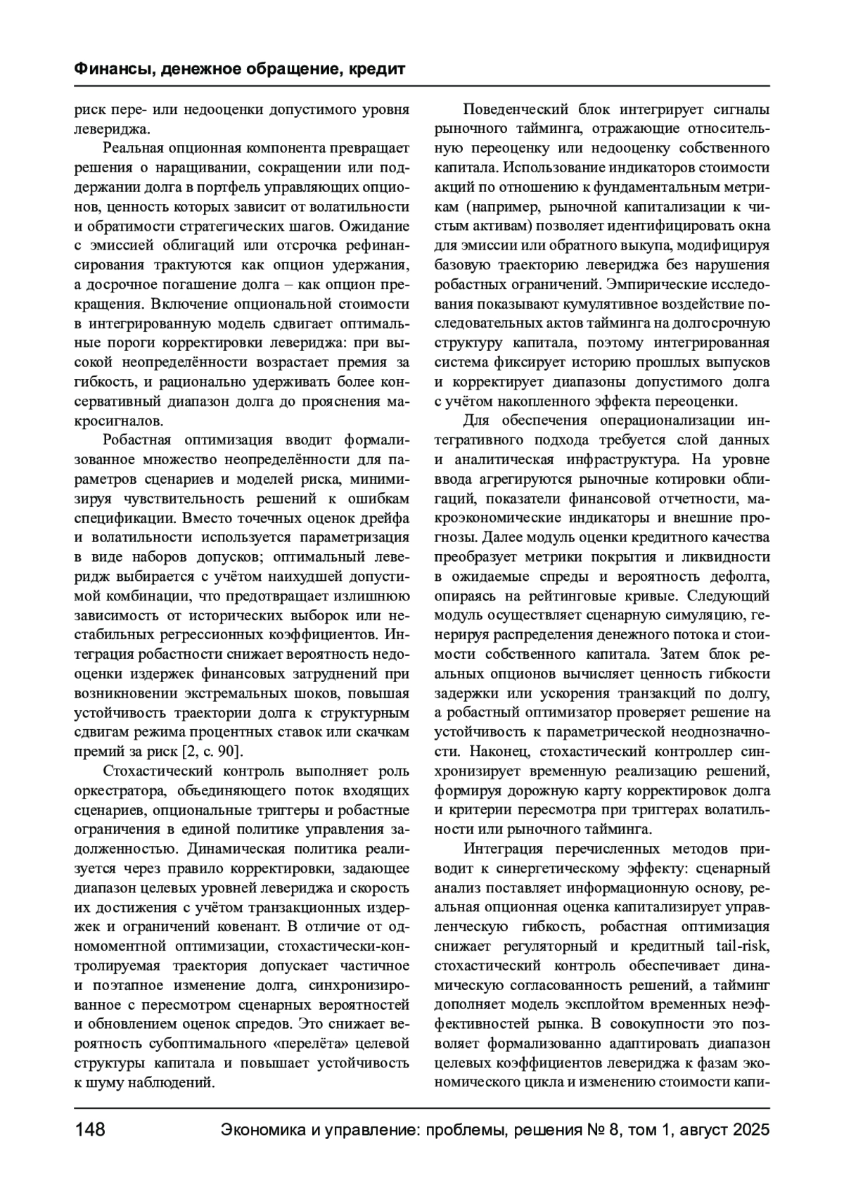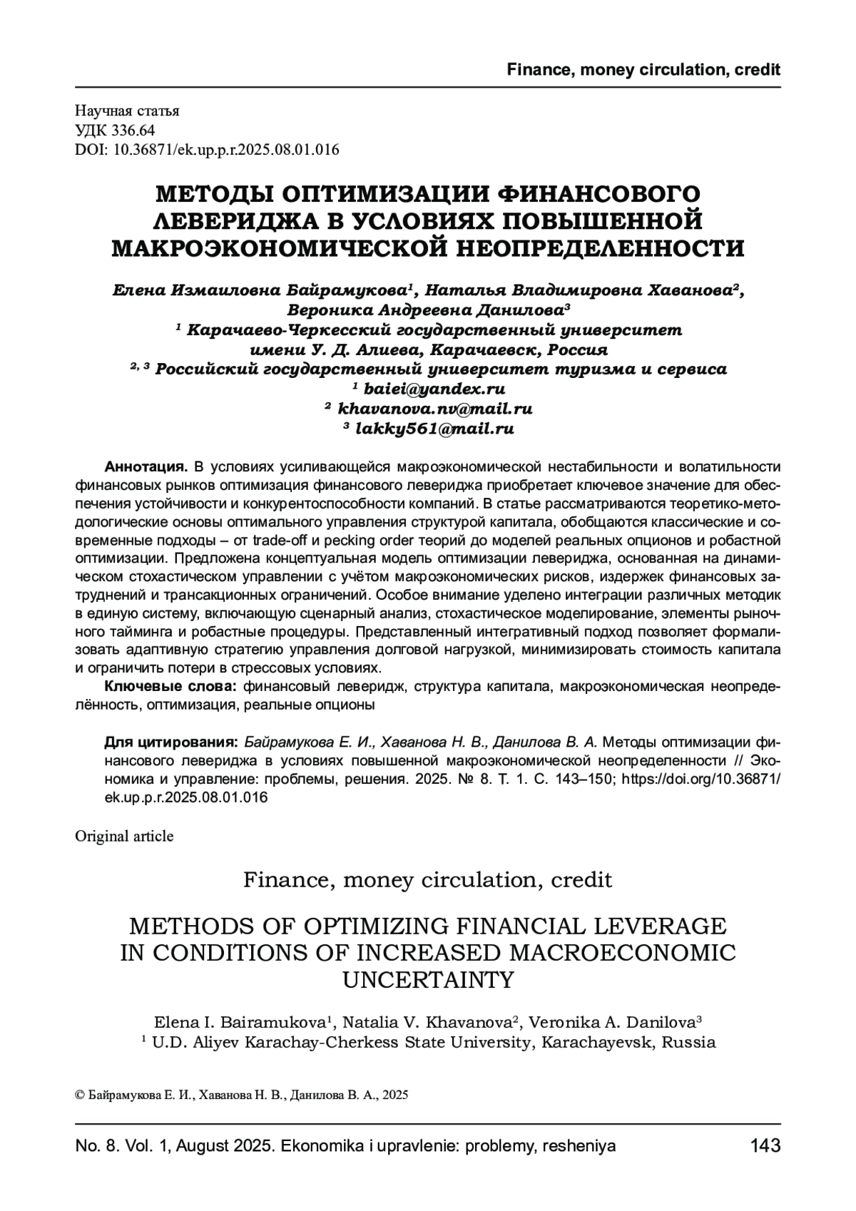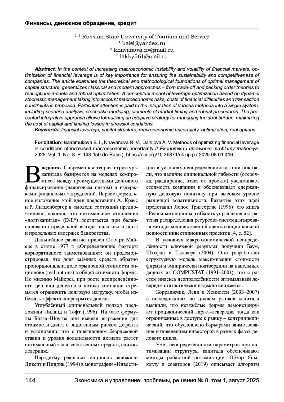 БАЙРАМУКОВА Е. И., ХАВАНОВА Н. В., ДАНИЛОВА В. А. МЕТОДЫ ОПТИМИЗАЦИИ ФИНАНСОВОГО ЛЕВЕРИДЖА В УСЛОВИЯХ ПОВЫШЕННОЙ МАКРОЭКОНОМИЧЕСКОЙ НЕОПРЕДЕЛЕННОСТИ // ЭКОНОМИКА И УПРАВЛЕНИЕ: ПРОБЛЕМЫ, РЕШЕНИЯ. 2025. ТОМ 1 № 8