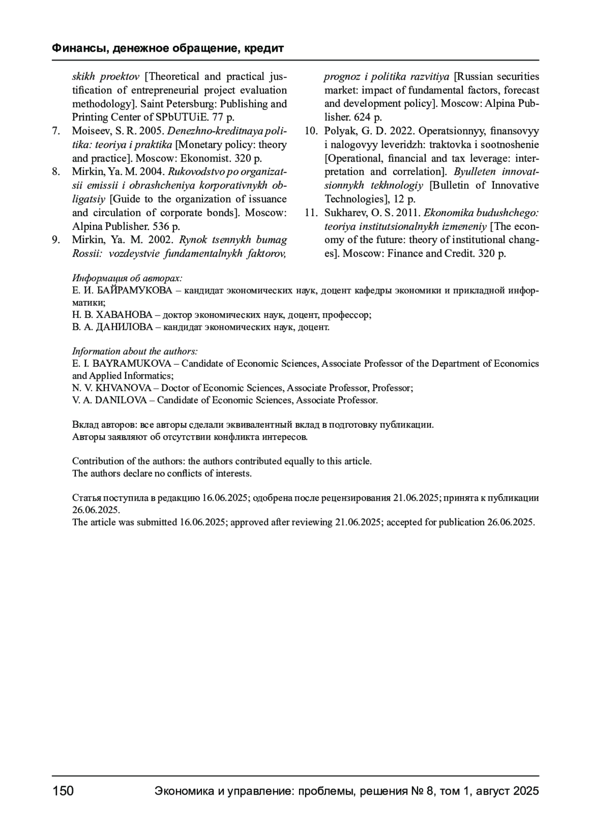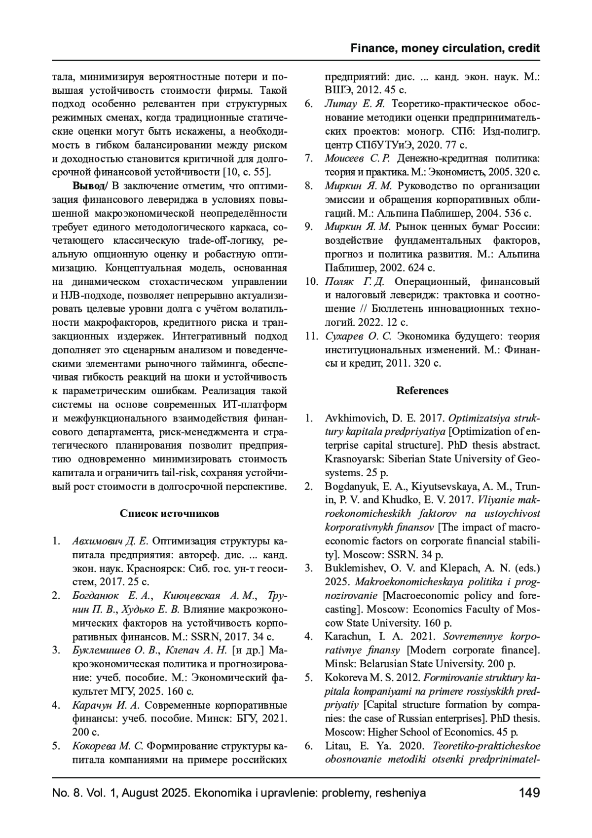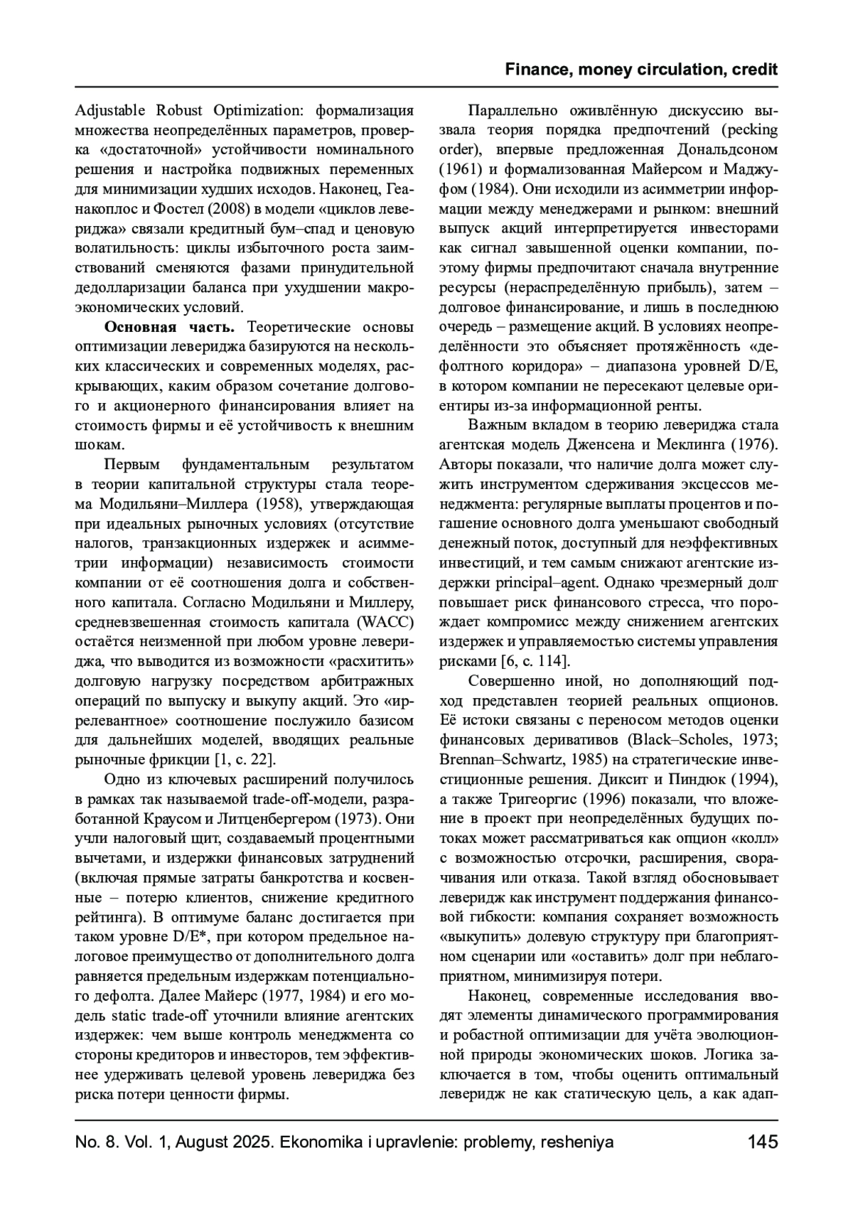 БАЙРАМУКОВА Е. И., ХАВАНОВА Н. В., ДАНИЛОВА В. А. МЕТОДЫ ОПТИМИЗАЦИИ ФИНАНСОВОГО ЛЕВЕРИДЖА В УСЛОВИЯХ ПОВЫШЕННОЙ МАКРОЭКОНОМИЧЕСКОЙ НЕОПРЕДЕЛЕННОСТИ // ЭКОНОМИКА И УПРАВЛЕНИЕ: ПРОБЛЕМЫ, РЕШЕНИЯ. 2025. ТОМ 1 № 8