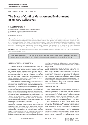 В статье рассматривается состояние конфликтности управленческой среды в воинских коллективах, исследуются основные причины конфликтов и влияние различных факторов на их возникновение и разрешение. В рамках исследования проводился сравнительный анализ стилей руководства и их влияния на уровень конфликтности, а также оценка влияния социально-демографических факторов. Методология включала анкетирование военнослужащих и полуструктурированные интервью с командирами подразделений. Результаты показали, что личностная неприязнь, культурные различия и стиль руководства играют ключевую роль в формировании конфликтных ситуаций. На основании полученных данных были выработаны рекомендации по управлению конфликтами и улучшению морально-психологического климата в воинских коллективах.