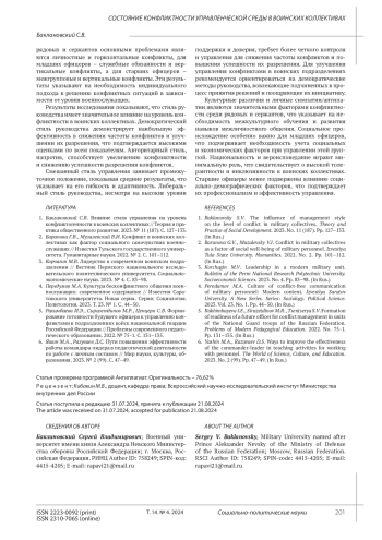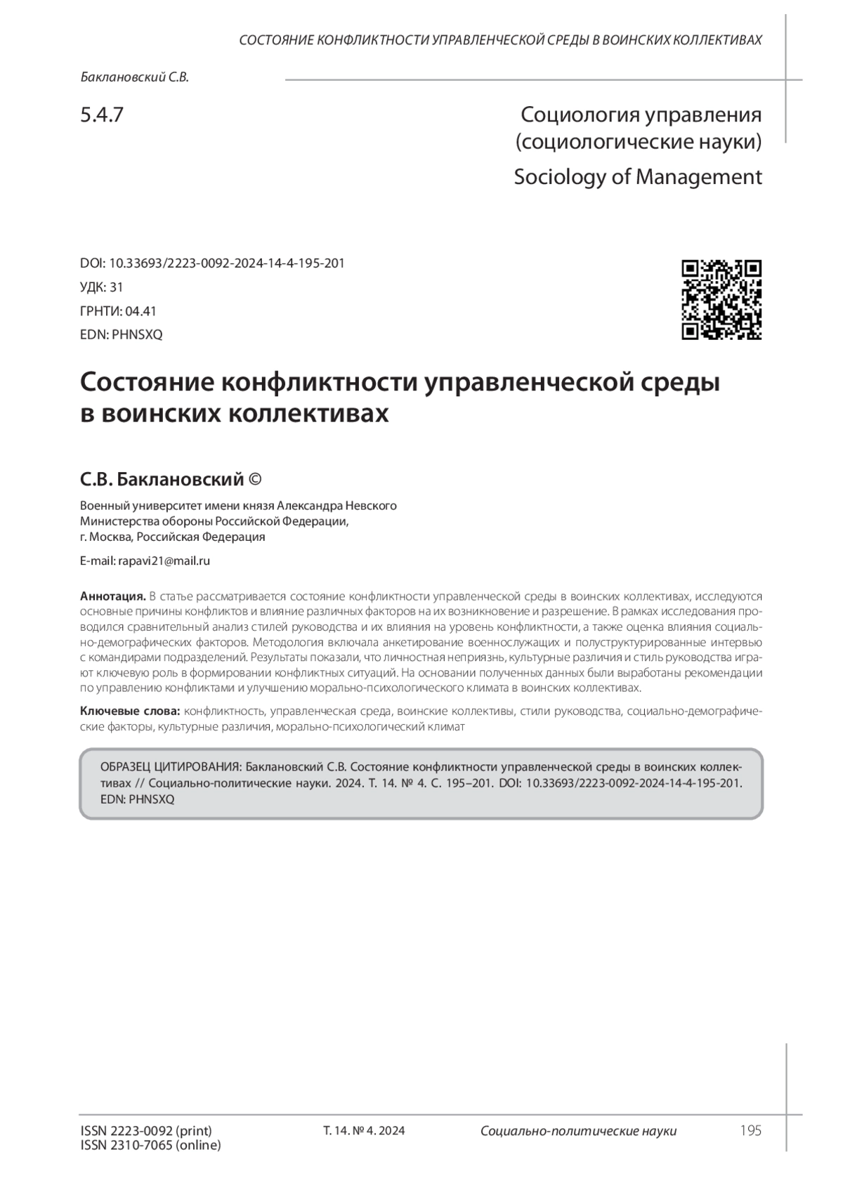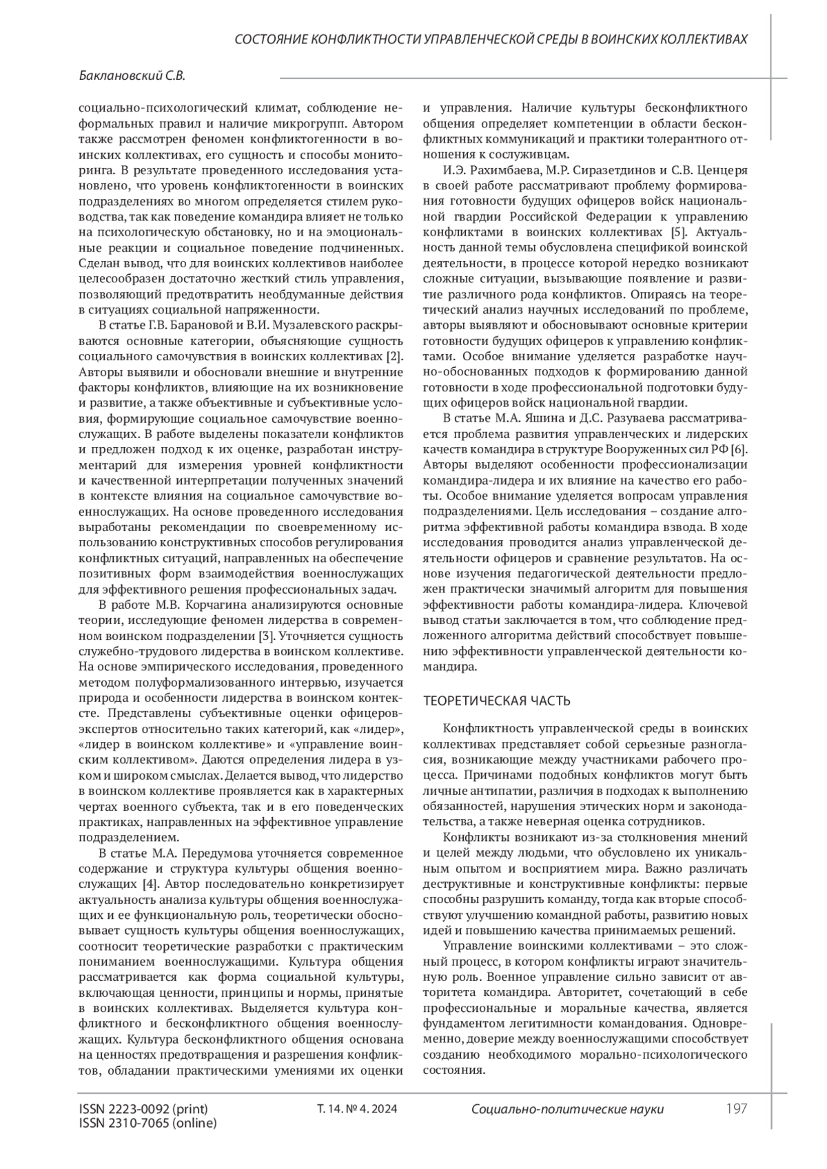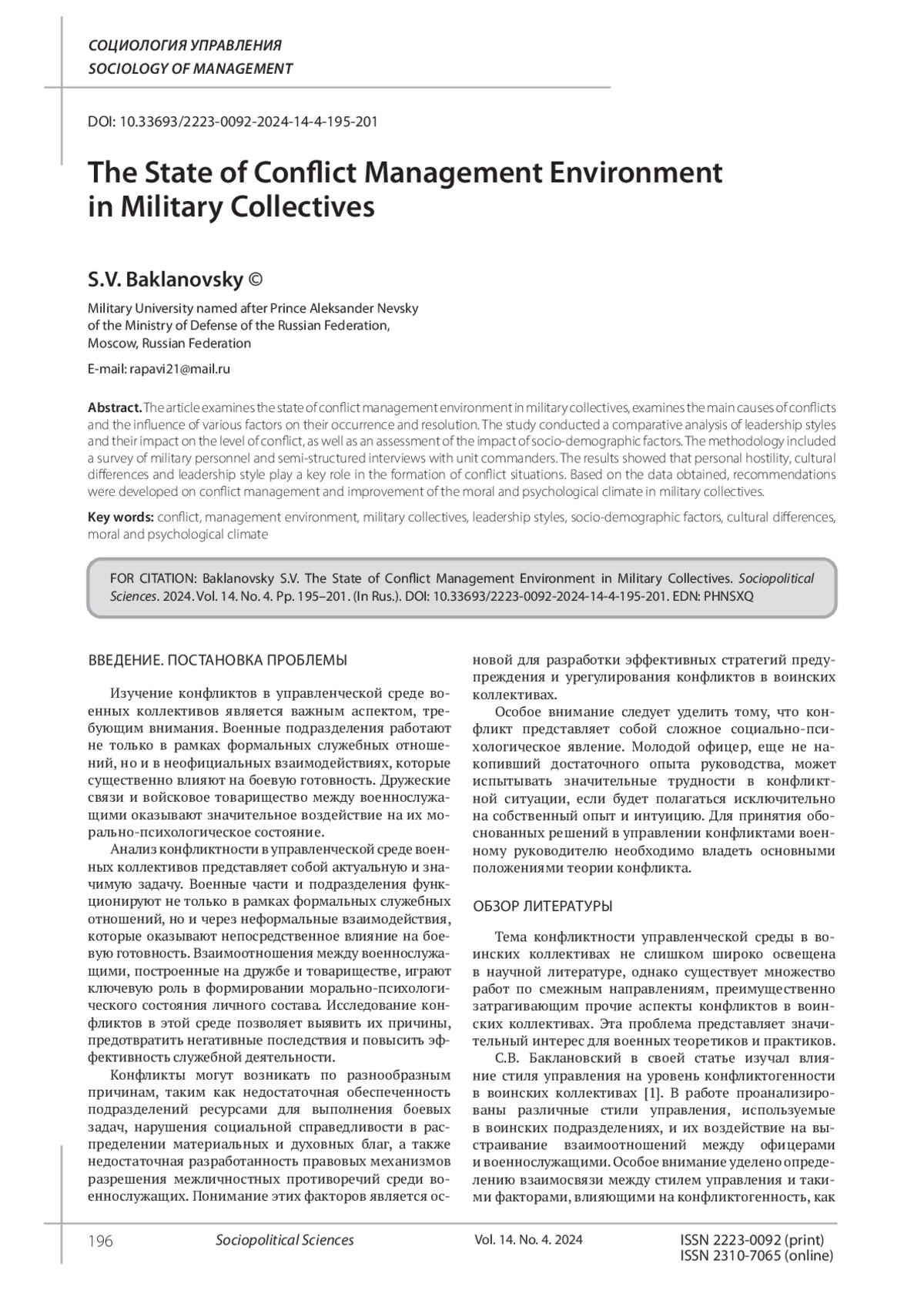 БАКЛАНОВСКИЙ С. В. СОСТОЯНИЕ КОНФЛИКТНОСТИ УПРАВЛЕНЧЕСКОЙ СРЕДЫ В ВОИНСКИХ КОЛЛЕКТИВАХ // СОЦИАЛЬНО-ПОЛИТИЧЕСКИЕ НАУКИ. 2024. Т. 14 № 4