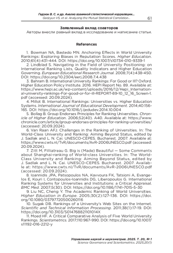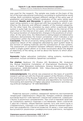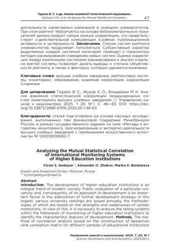 ГЕДЗЮН В. С., ЖУКОВ А. О., БОНДАРЕВА М. К. АНАЛИЗ ВЗАИМНОЙ СТАТИСТИЧЕСКОЙ КОРРЕЛЯЦИИ МЕЖДУНАРОДНЫХ СИСТЕМ МОНИТОРИНГА ВЫСШИХ УЧЕБНЫХ ЗАВЕДЕНИЙ // УПРАВЛЕНИЕ НАУКОЙ И НАУКОМЕТРИЯ. 2025. Т. 20 № 1