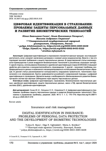 Цифровая идентификация в страховании становится важным трендом: она повышает доступность услуг, ускоряет заключение договоров и снижает риски мошенничества. Вместе с тем это порождает высокие требования к защите персональных данных. В представленной статье анализируются преимущества и риски внедрения биометрических технологий в российском страховом секторе. С одной стороны, использование биометрии и удалённой идентификации (через ЕСИА/ЕБС) повышает удобство для клиентов и конкурентоспособность страховщиков. С другой - возникают проблемы конфиденциальности данных и возможного несанкционированного использования биометрических образцов. В данной статье рассматриваются контраргументы (нарушение приватности, технические ограничения) и их опровержения. Кратко сравниваются российский и американский подходы к цифровой идентификации в страховании. Делается вывод о необходимости сбалансированного развития биометрических систем при жёстком соблюдении норм защиты персональных данных.