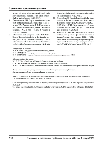 3. Артамонова Я.В., Биометрические технологии: отношение населения и преодоление рисков / Я.В.Артамонова, С.С. Барсуков, А.А. Суханова // Государственное и муниципальное управление. Ученые записки. - 2024. - № 1. - С. 231-236.