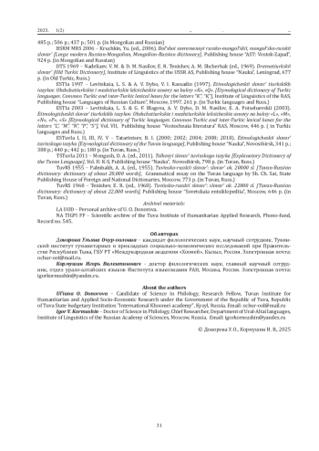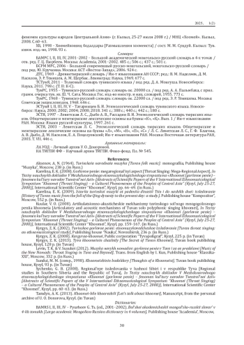 Для составления словарных статей поставлены следующиезадачи: 1. Систематическая группировка собранных материалов;2. Предоставление полного музыкально-терминологическогозначения в каждой словарной статье с наглядными примерами. Результаты исследования основаны на анализе словарей, специальной литературы, архивных материалов, рукописей иинтервью с исполнителями-мастерами хоомея.