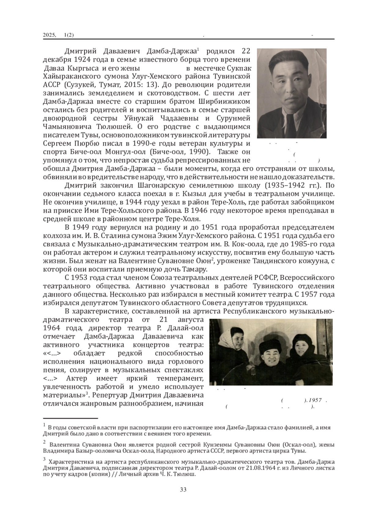 Дмитрий Давааевич Дамба-Даржаа1 родился 22 декабря 1924 года в семье известного борца того времени Хайыраканского сумона Улуг-Хемского района Тувинской АССР (Сузукей, Тумат, 2015: 13). До революции родители занимались земледелием и скотоводством. С шести лет Дамба-Даржаа вместе со старшим братом Ширбиижиком остались без родителей и воспитывались в семье старшей двоюродной сестры Уйнукай Чадааевны и Сурунмей Чамыяновича Тюлюшей. О его родстве с выдающимся писателем Тувы, основоположником тувинской литературы Сергеем Пюрбю писал в 1990-е годы ветеран культуры и спорта Биче-оол Монгул-оол (Биче-оол, 1990). Также он упомянул о том, что непростая судьба репрессированных не обошла Дмитрия Дамба-Даржаа – были моменты, когда его отстраняли от школы, обвиняли во вредительстве народу, что в действительности не нашло доказательств.
