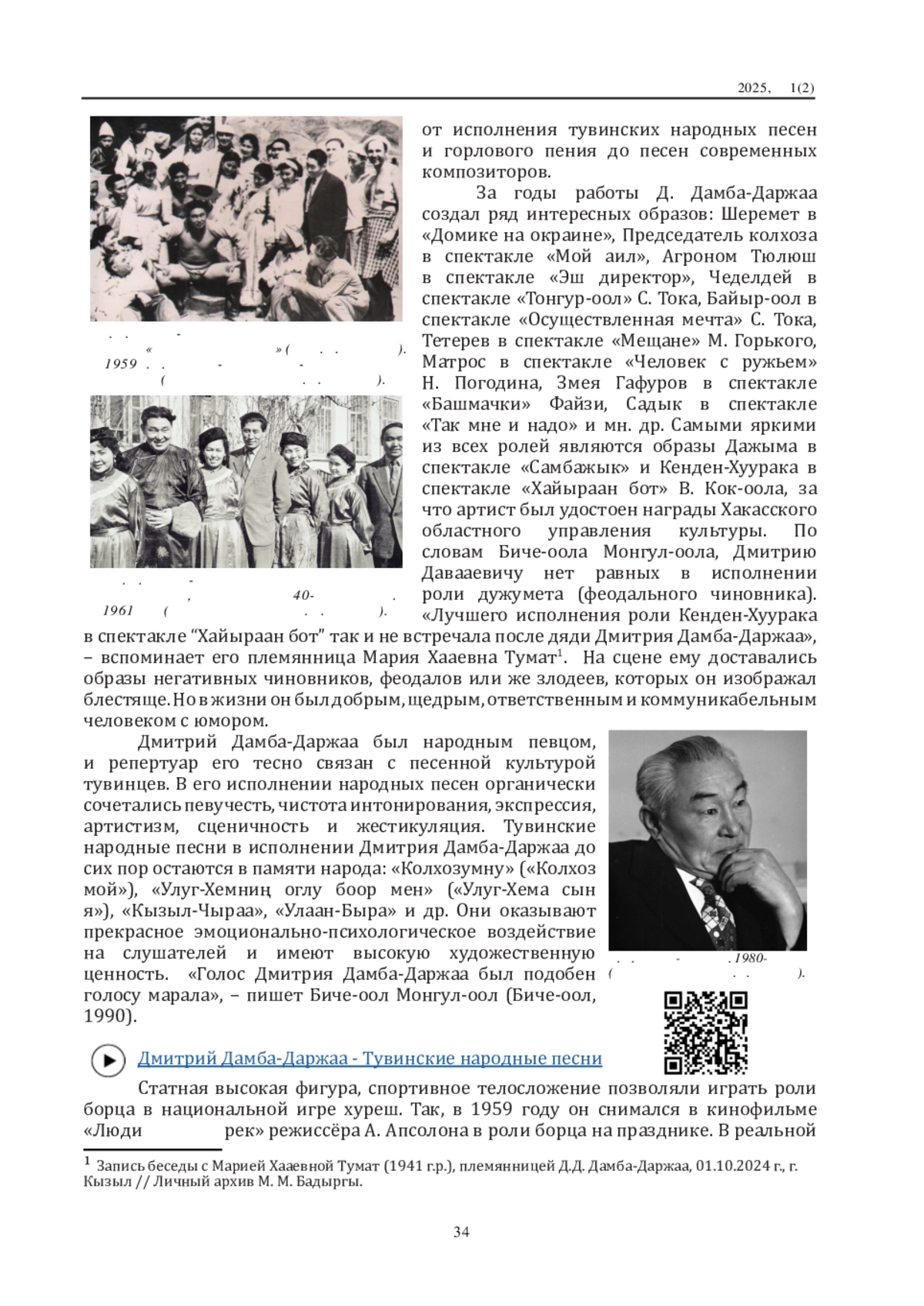 В декабре 2024 года исполнилось 100 лет со дня рождения Дмитрия Давааевича Дамба-Даржаа (1924– 1990), известного артиста, хоомейжи Тувы, знатока и носителя народных песен. Статья содержит сведения и факты из его жизни. Материалы для статьи были представлены внучатой племянницей Д. Д. Дамба-Даржаа Чечен Кок-кысовной Тюлюш, которые помогли сформировать портрет и образ выдающегося человека культуры Тувы, чей жизненный путь был синхронен с жизнью тувинского драматического театра в советский период. Из его многогранного таланта автор акцентирует недооцененный талант Дамба-Даржаа-хоомейжи и носителя народных песен. Ценность представляют нотные примеры и публикация его песенного репертуара. Основную свою задачу автор видит в выражении дани уважения и почитания человеку искусства, который внес большой вклад в формирование театрального искусства и музыкального фольклора Тувы/