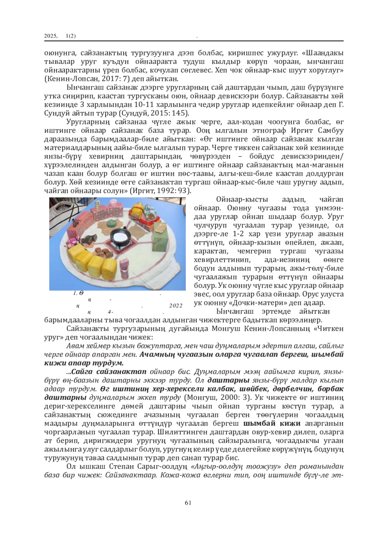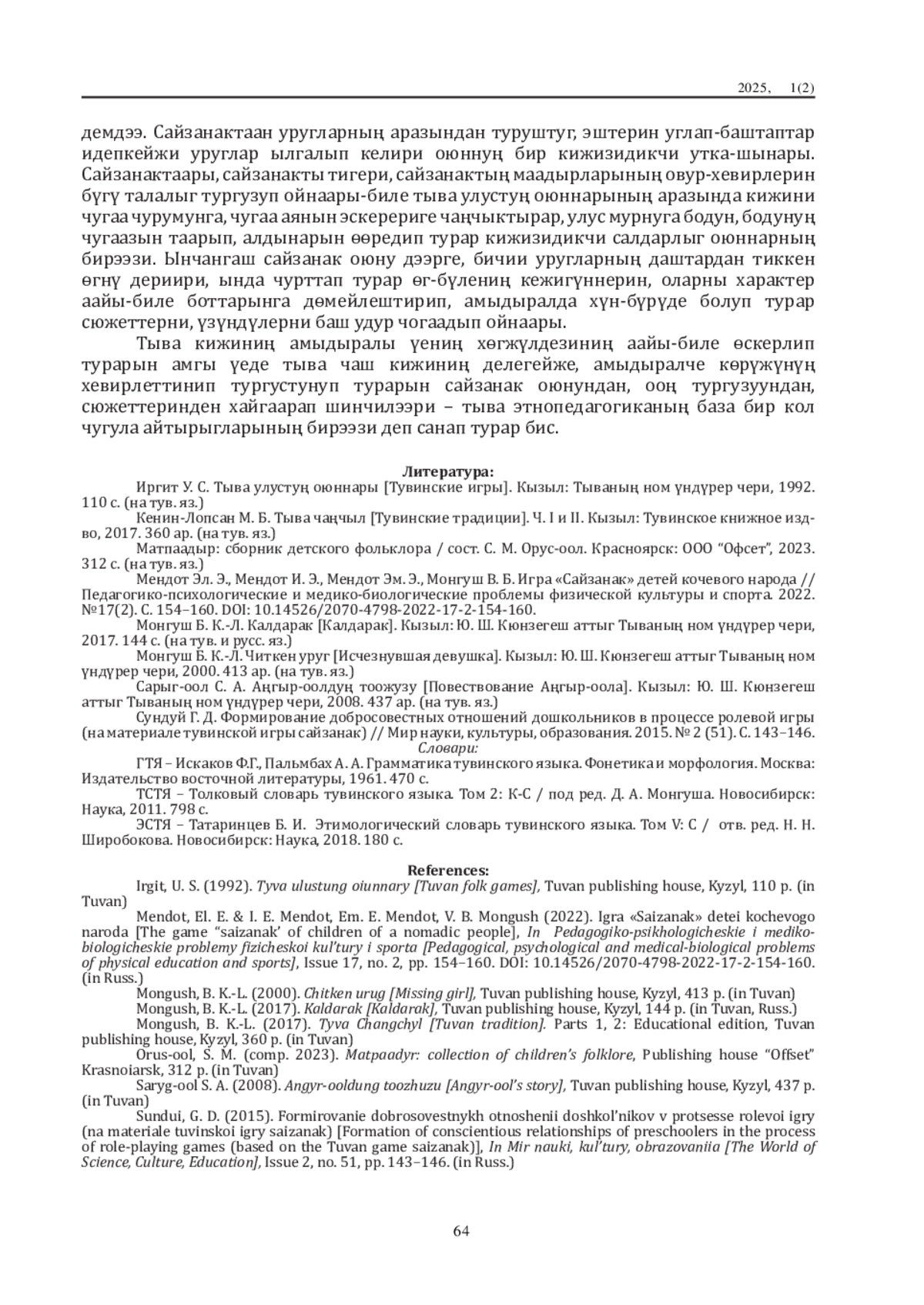 4. Мендот Эл. Э., Мендот И. Э., Мендот Эм. Э., Монгуш В. Б. Игра «Сайзанак» детей кочевого народа // Педагогико-психологические и медико-биологические проблемы физической культуры и спорта. 2022. № 17(2). С. 154–160. DOI: 10.14526/2070-4798-2022-17-2-154-160 EDN: GKQWRK