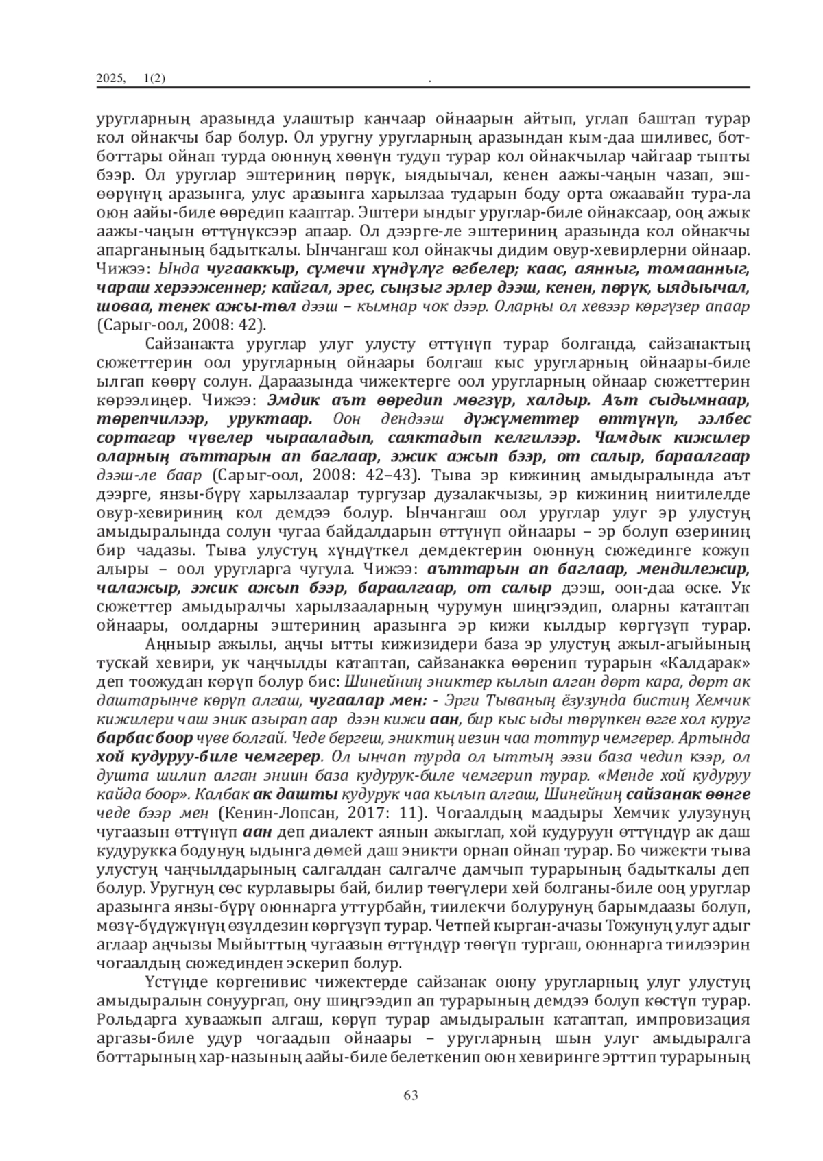 8. Сундуй Г. Д. Формирование добросовестных отношений у дошкольников в процессе сюжетно-ролевой игры (на материале тувинской игры сайзанак) // Мир науки, культуры, образования. 2015. № 2 (51). С. 143–146.