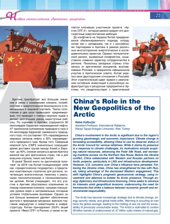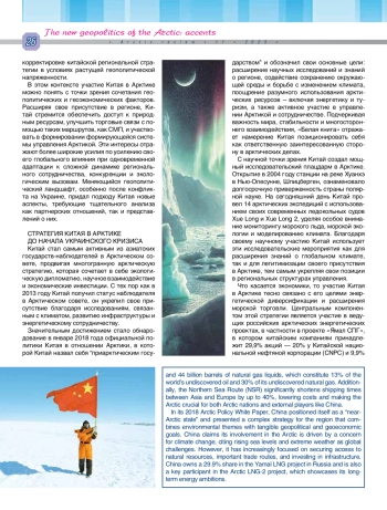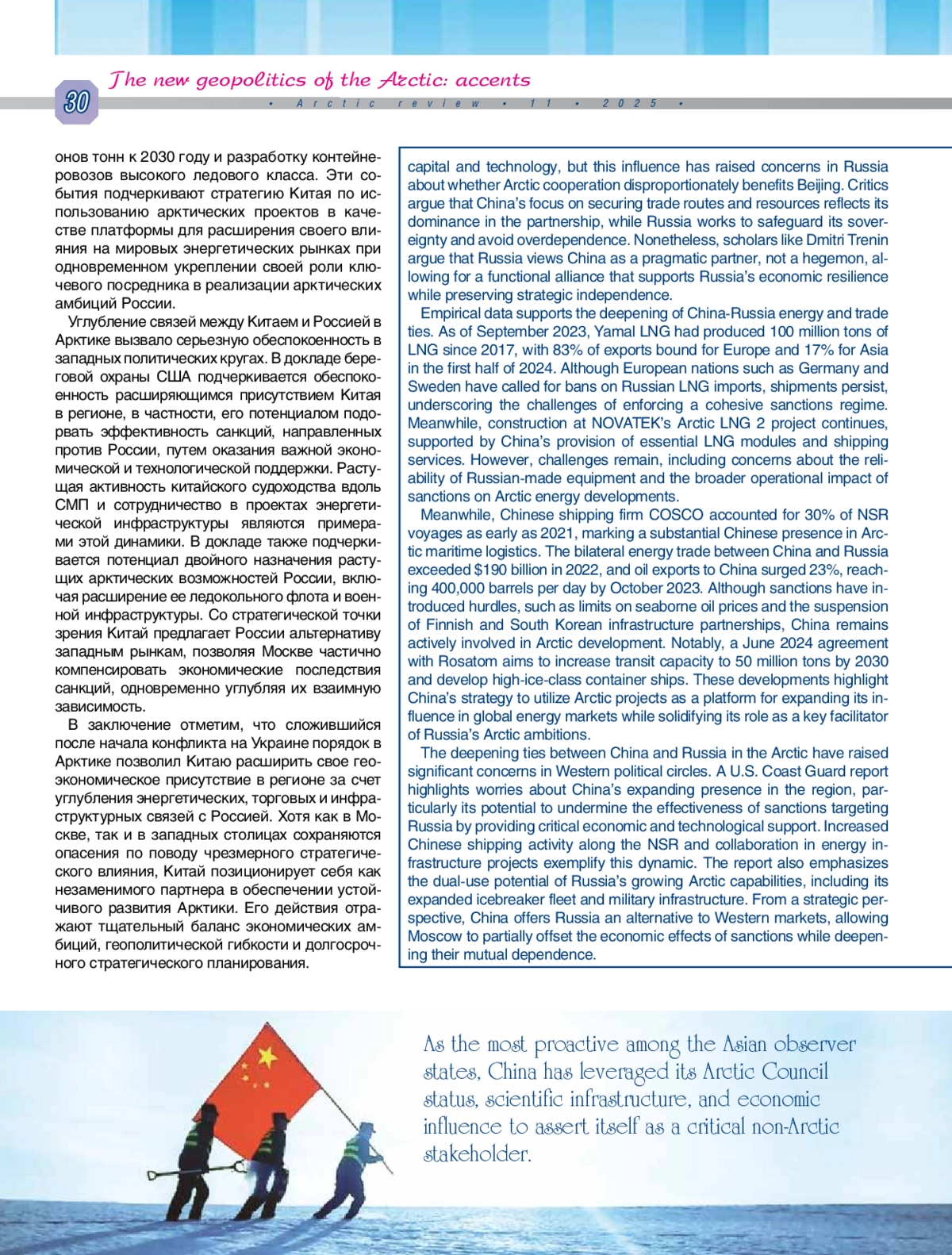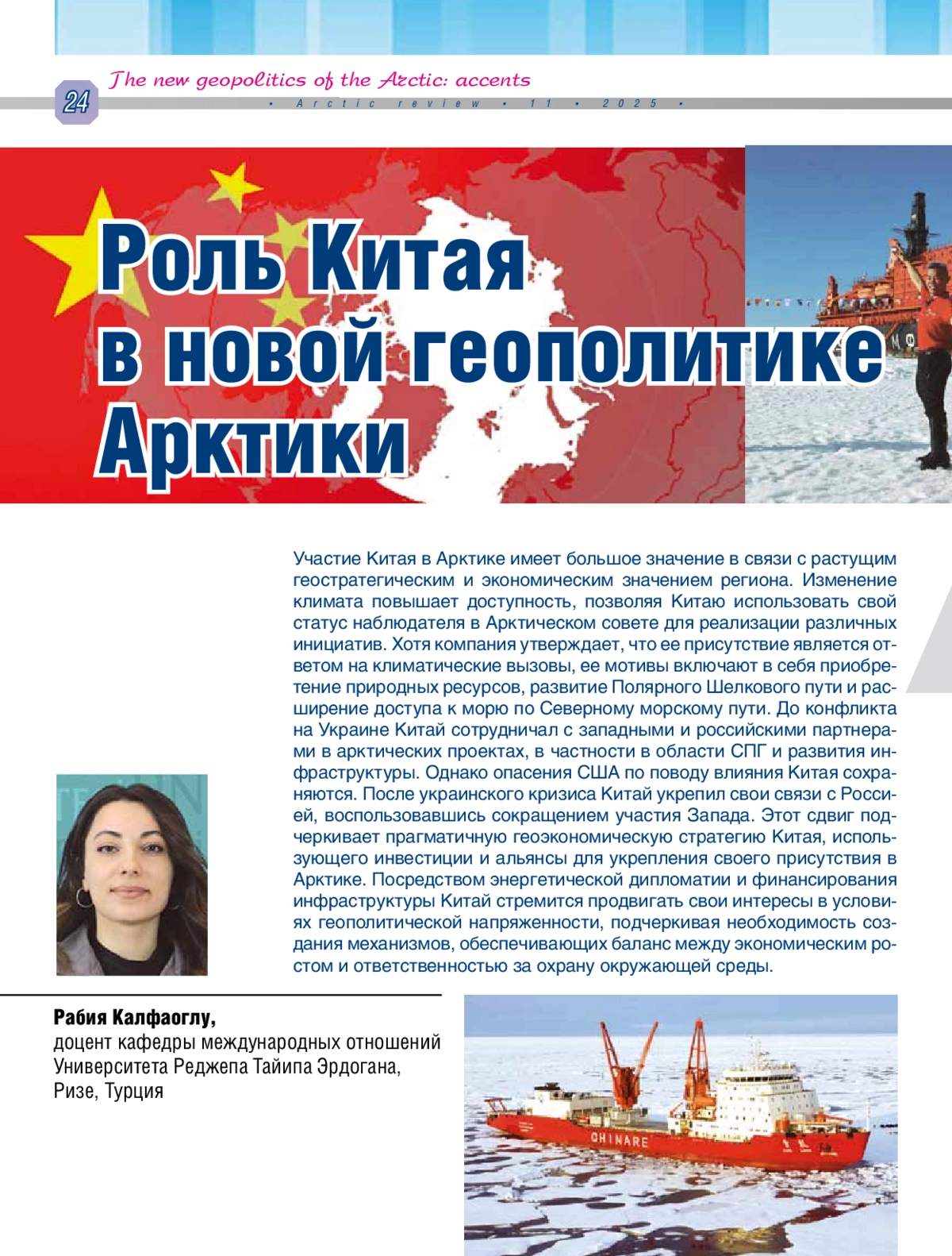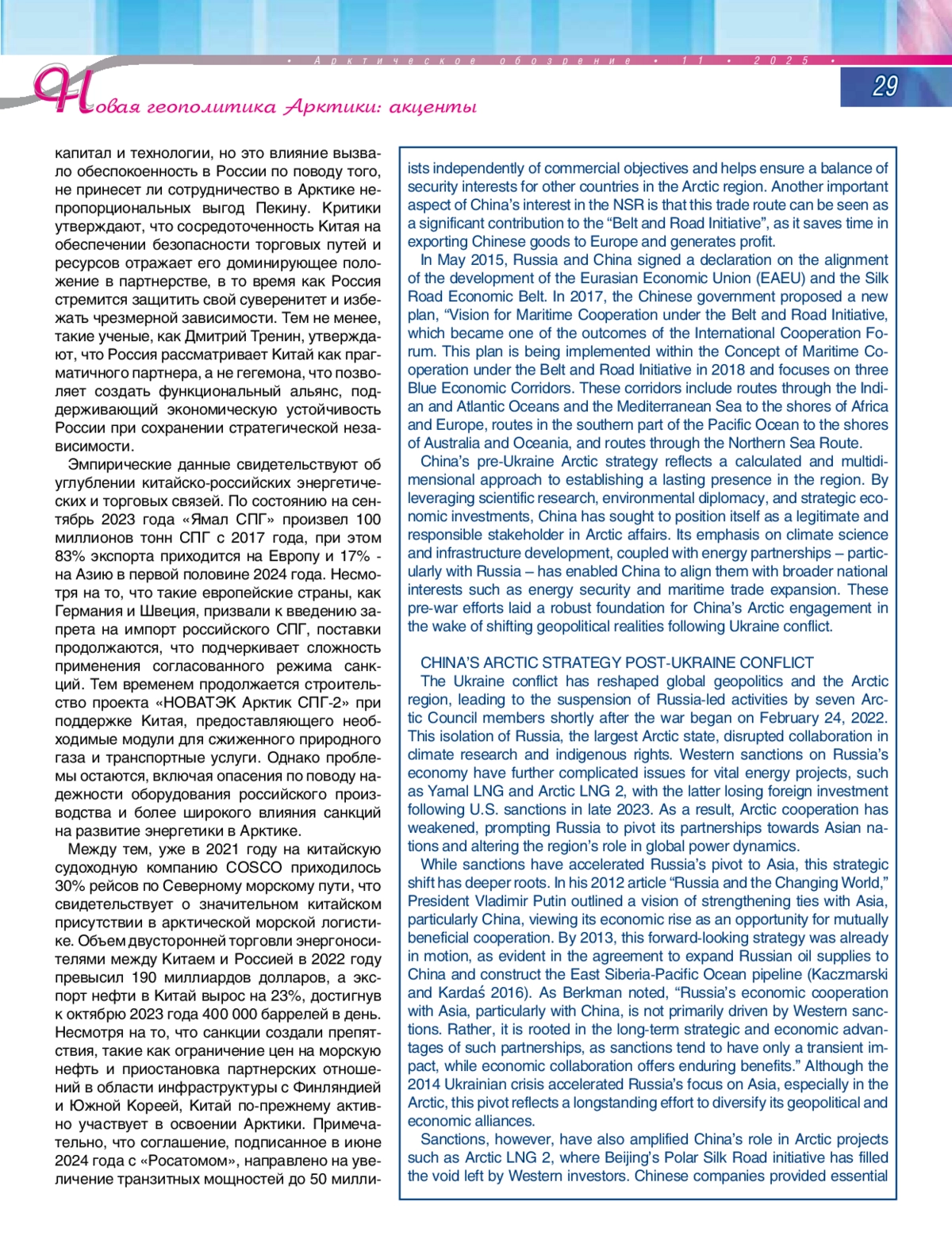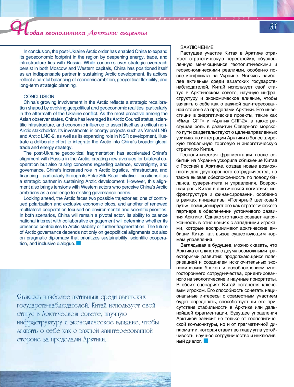 Участие Китая в Арктике имеет большое значение в связи с растущим геостратегическим и экономическим значением региона. Изменение климата повышает доступность, позволяя Китаю использовать свой статус наблюдателя в Арктическом совете для реализации различных инициатив. Хотя компания утверждает, что ее присутствие является ответом на климатические вызовы, ее мотивы включают в себя приобретение природных ресурсов, развитие Полярного Шелкового пути и расширение доступа к морю по Северному морскому пути. До конфликта на Украине Китай сотрудничал с западными и российскими партнерами в арктических проектах, в частности в области СПГ и развития инфраструктуры. Однако опасения США по поводу влияния Китая сохраняются. После украинского кризиса Китай укрепил свои связи с Россией, воспользовавшись сокращением участия Запада. Этот сдвиг подчеркивает прагматичную геоэкономическую стратегию Китая, использующего инвестиции и альянсы для укрепления своего присутствия в Арктике. Посредством энергетической дипломатии и финансирования инфраструктуры Китай стремится продвигать свои интересы в условиях геополитической напряженности, подчеркивая необходимость создания механизмов, обеспечивающих баланс между экономическим ростом и ответственностью за охрану окружающей среды.